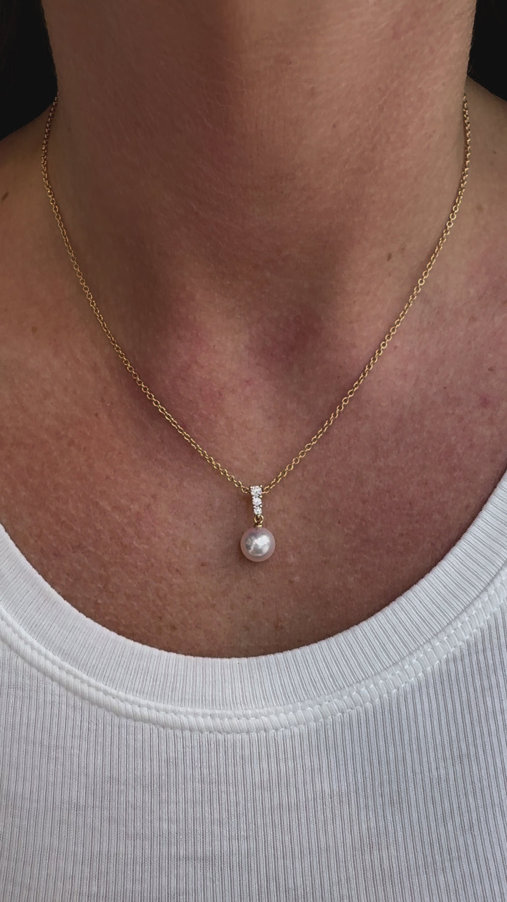 Mikimoto Morning Dew 18K Rose Gold 3 Diamonds 10MM Pearl Pendant Necklace
