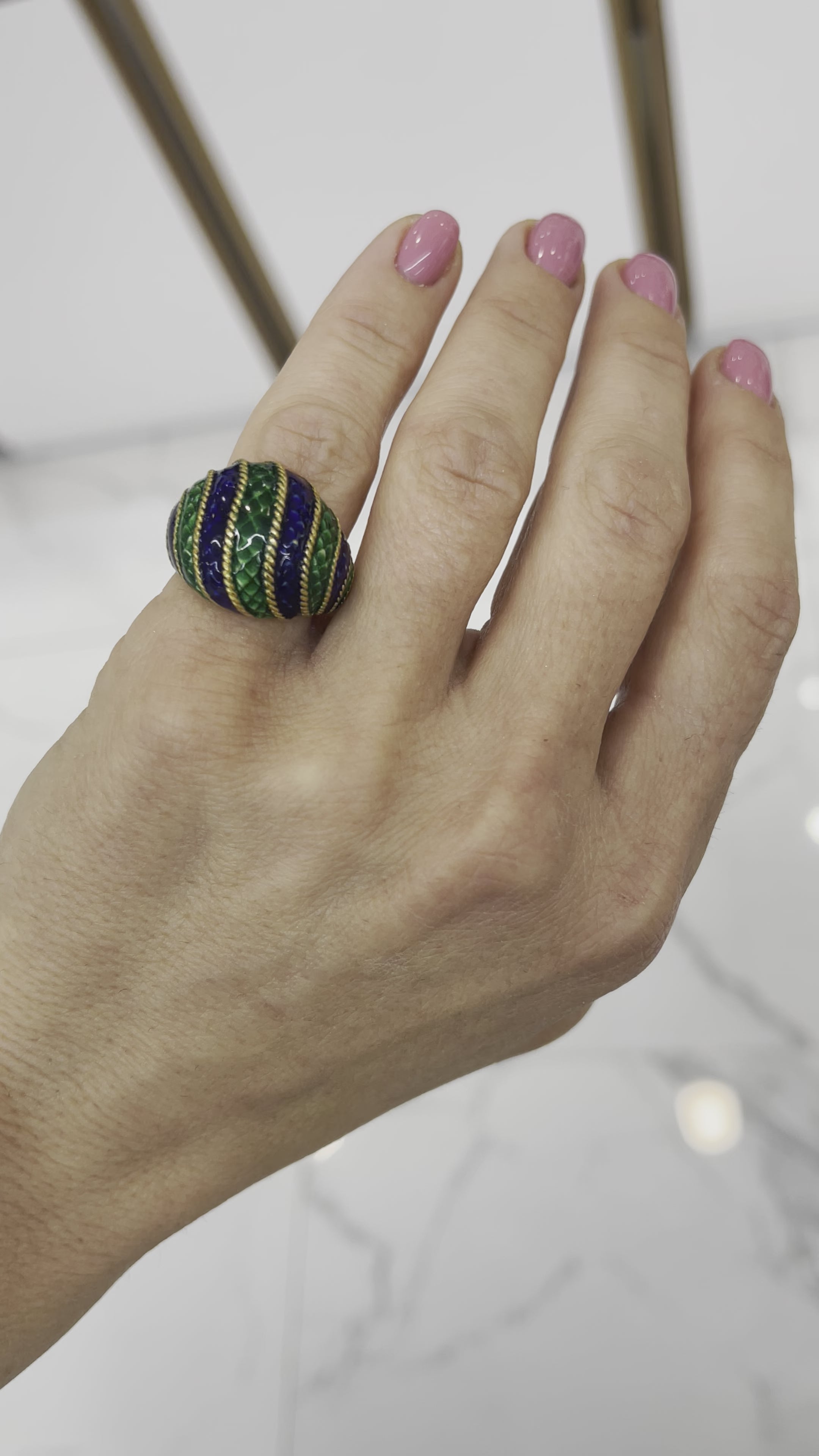 Handmade vintage 18K yellow gold and blue & green enamel with a tapered shank.
