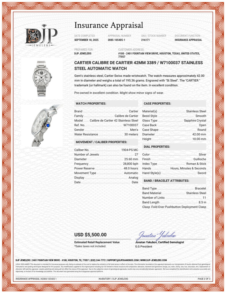 Cartier Calibre de Cartier 42MM 3389 / W7100037 Stainless Steel Automatic Watch