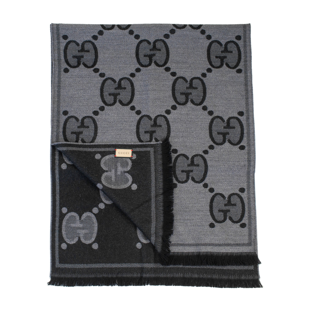 Gucci Gg Jumbo Wool Silk Jacquard Scarf in Grey and Black Cashmere Scarf