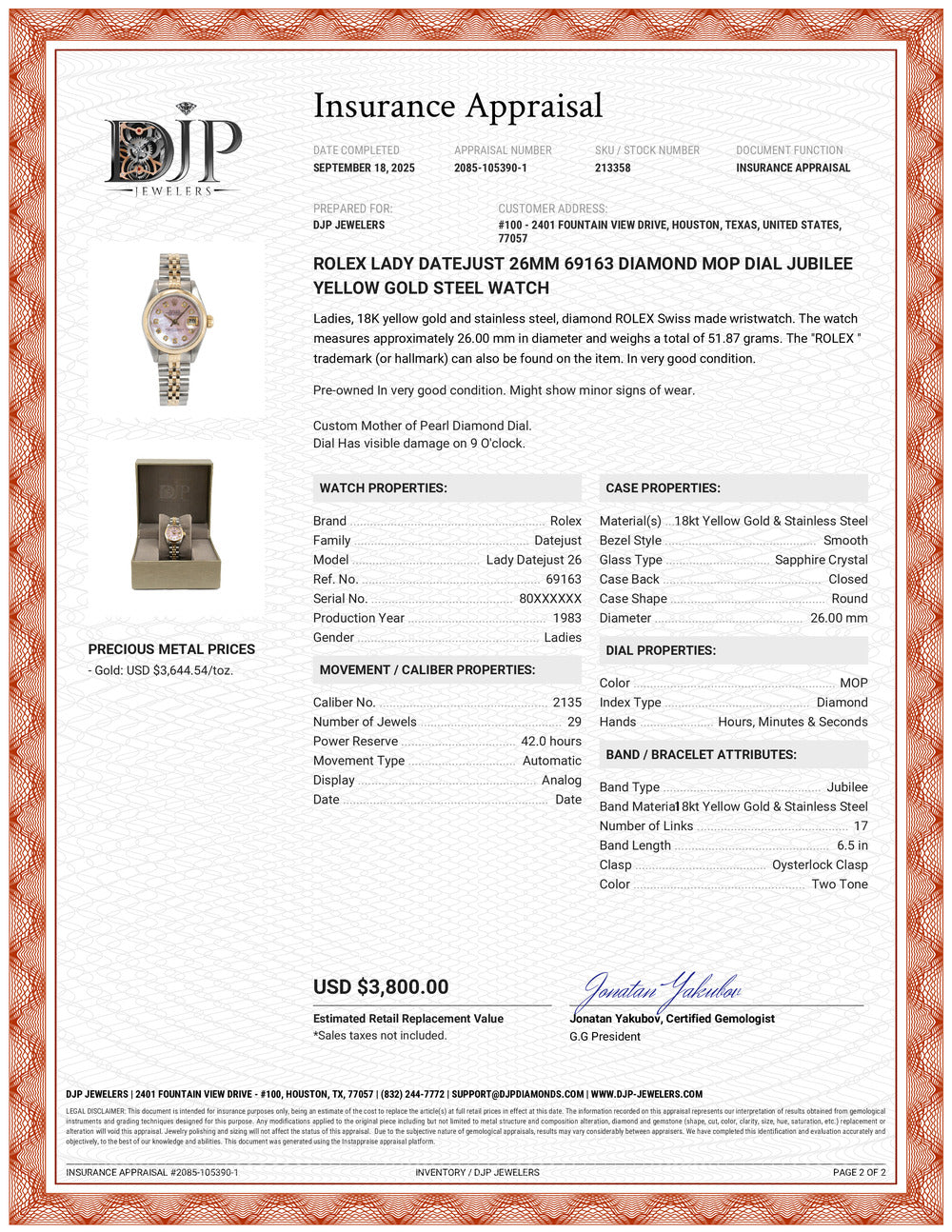 Rolex Lady Datejust 26MM 69163 Diamond Mop Dial Jubilee Yellow Gold Steel Watch