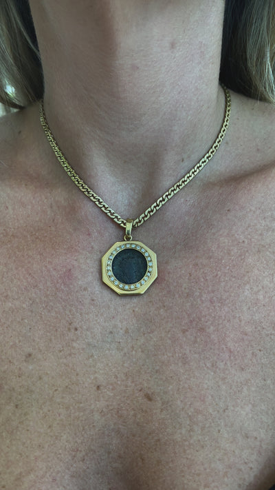 Vintage 18K Yellow Gold Ancient Coin Halo Diamond Razor Link Pendant Necklace