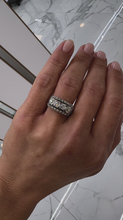 Ladies handmade filigreed, textured, palladium, silver and white gold four-across, diamond edwardian (1901-1920) engagement ring with a half round shank, with sizing balls. The metals were tested and determined to be palladium, silver and white gold. Engraved with "154".