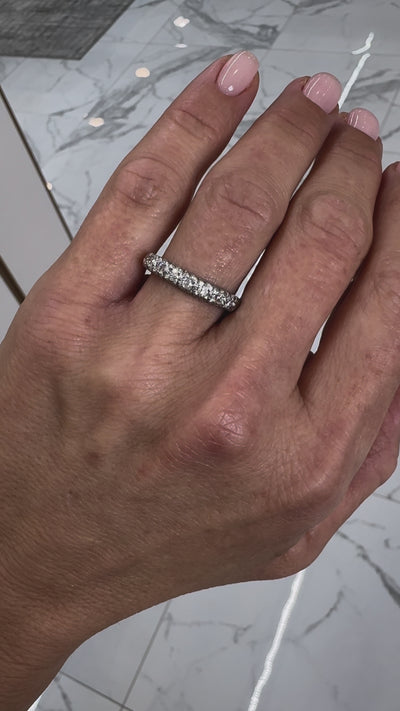 Ladies handmade platinum seven-across, diamond antique wedding band with a half-round shank. The metal was tested and determined to be platinum. Engraved with "PLATINUM". In excellent condition.