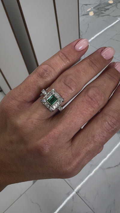 Antique Mixed Metals Gold Silver Palladium Emerald Halo Diamond Cocktail Ring