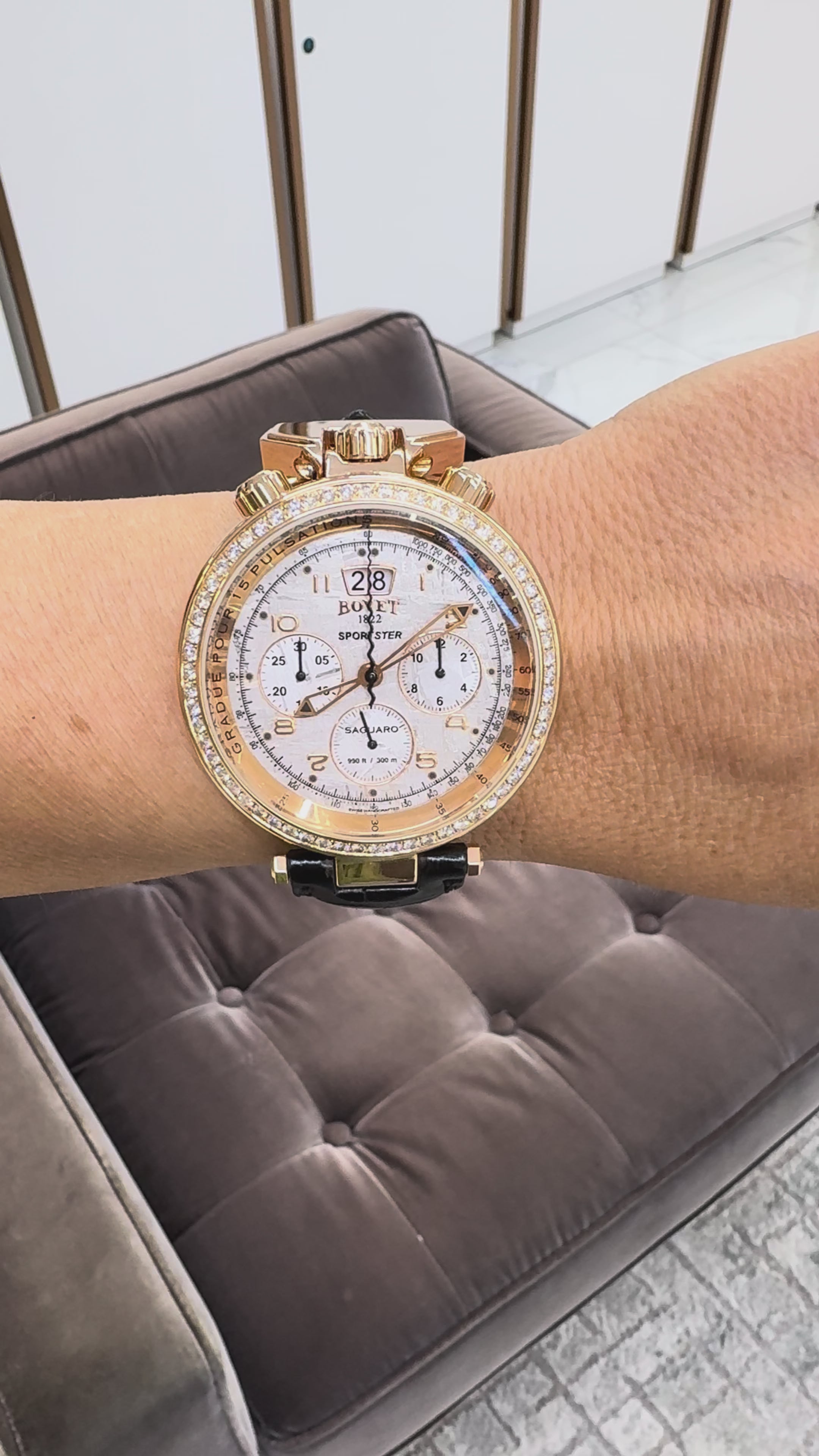 Gent's BOVET 1822 18K rose gold diamond Swiss-made wristwatch with original box. Engraved with "750". The "BOVET " trademark (or hallmark) can also be found on the item.