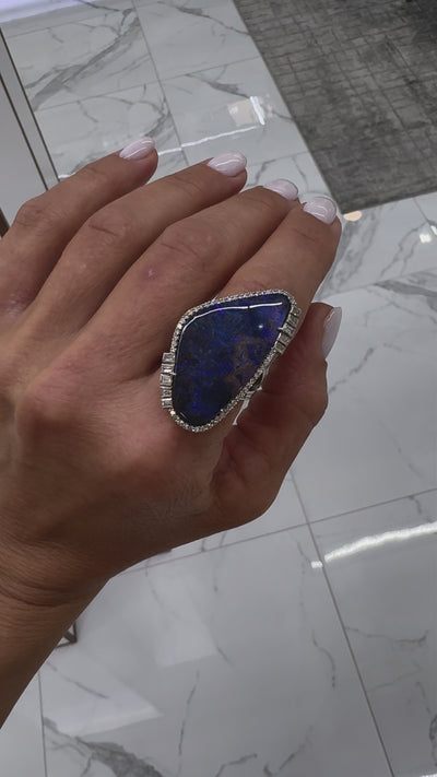 Vintage 18K White Gold Blue Opal Doublet Halo Diamond Cocktail Ring