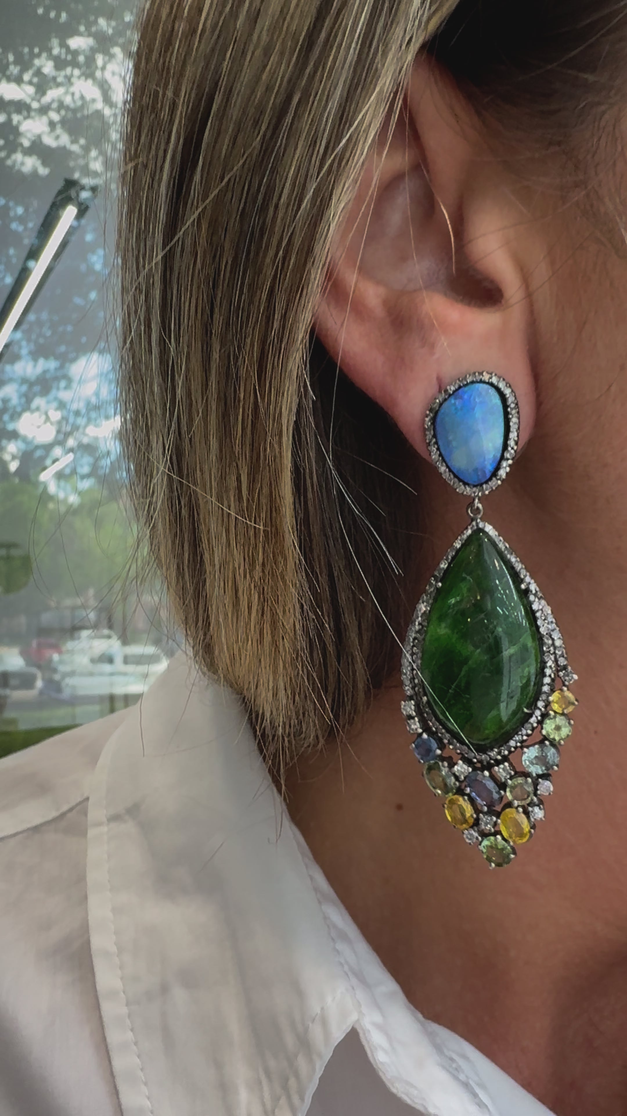 Vintage Silver Tourmaline Opal Multi Color Sapphire & Diamond Drop Earrings