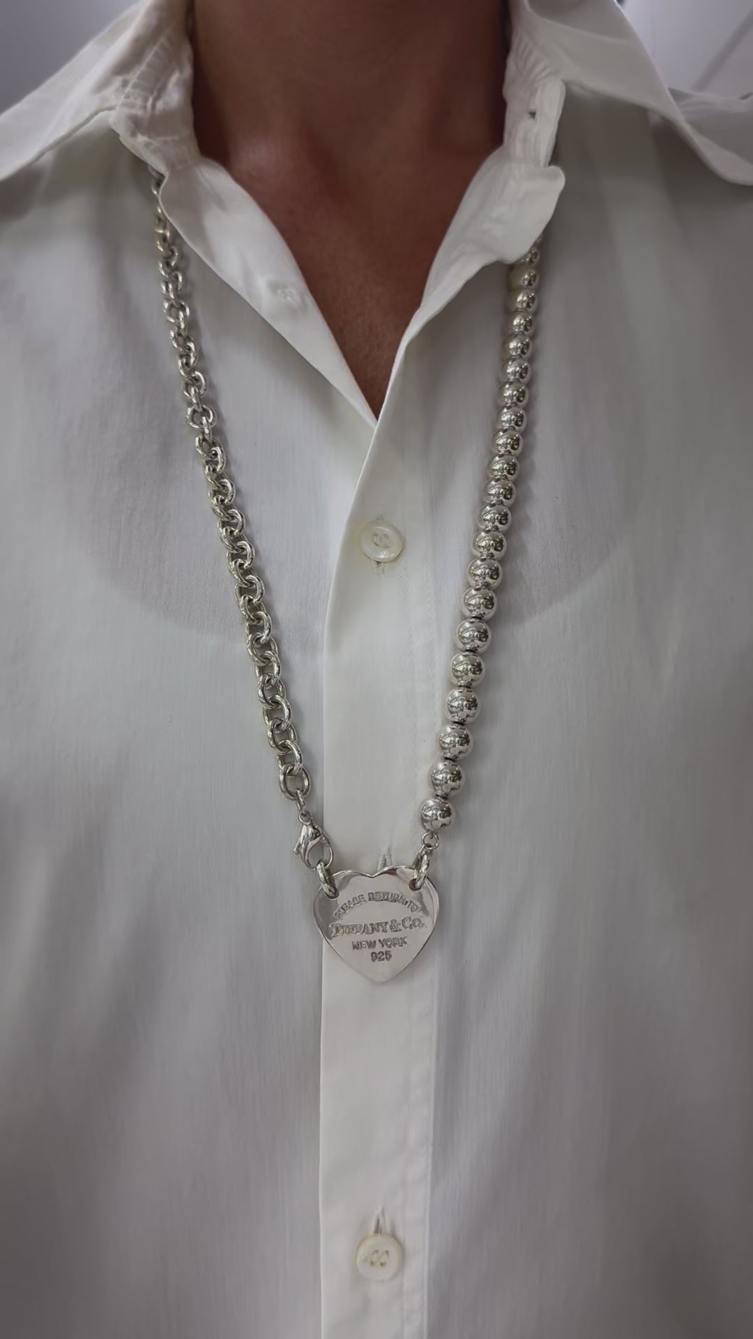 Ladies silver necklace. The metal was tested and determined to be 925 (STERLING) silver. Engraved with "925". The "Tiffany & Co." trademark (or hallmark) can also be found on the item. In excellent condition.