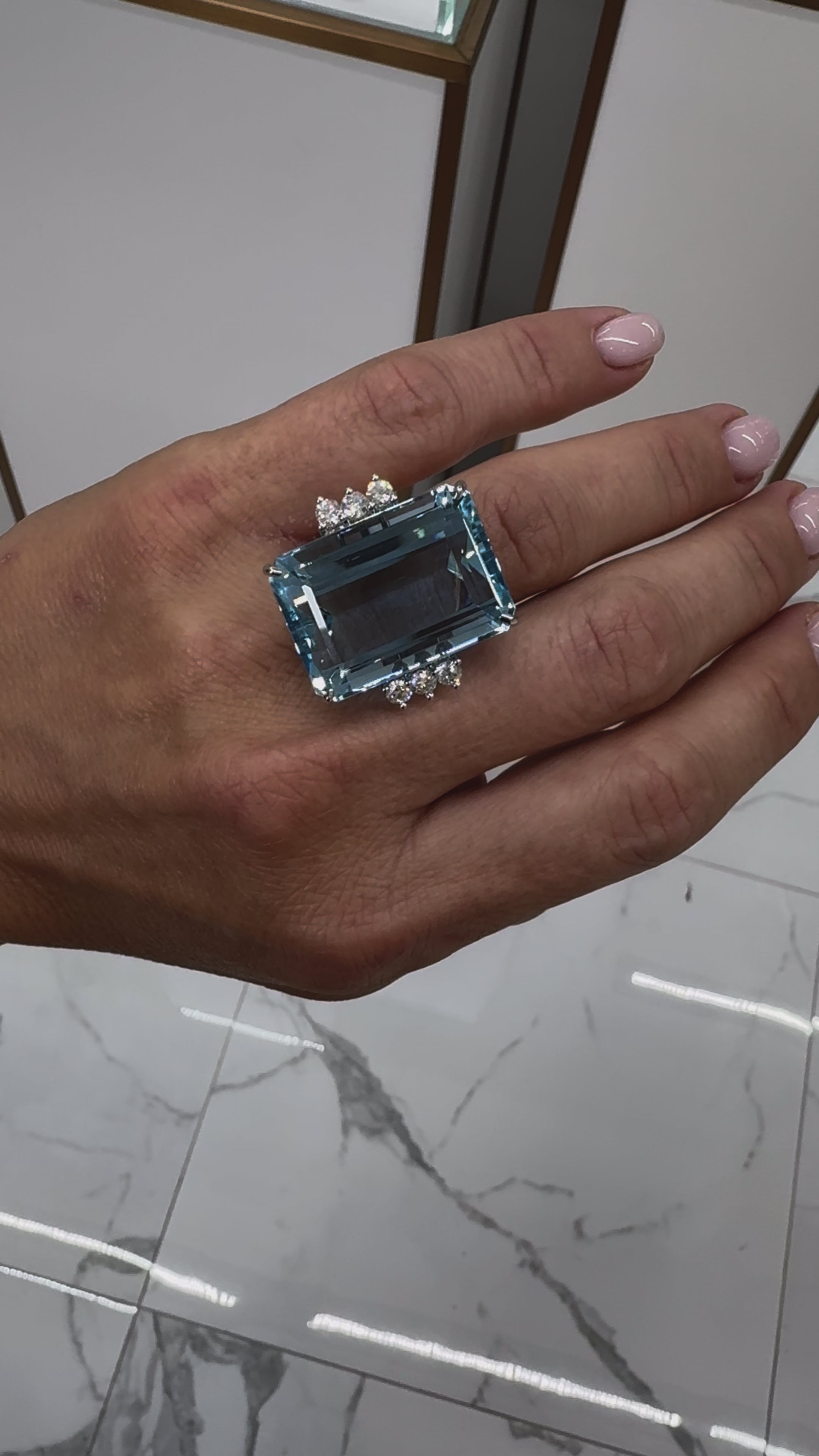 Vintage Ladies 18K White Gold 41.38ct Aquamarine Six Diamond Cocktail Ring