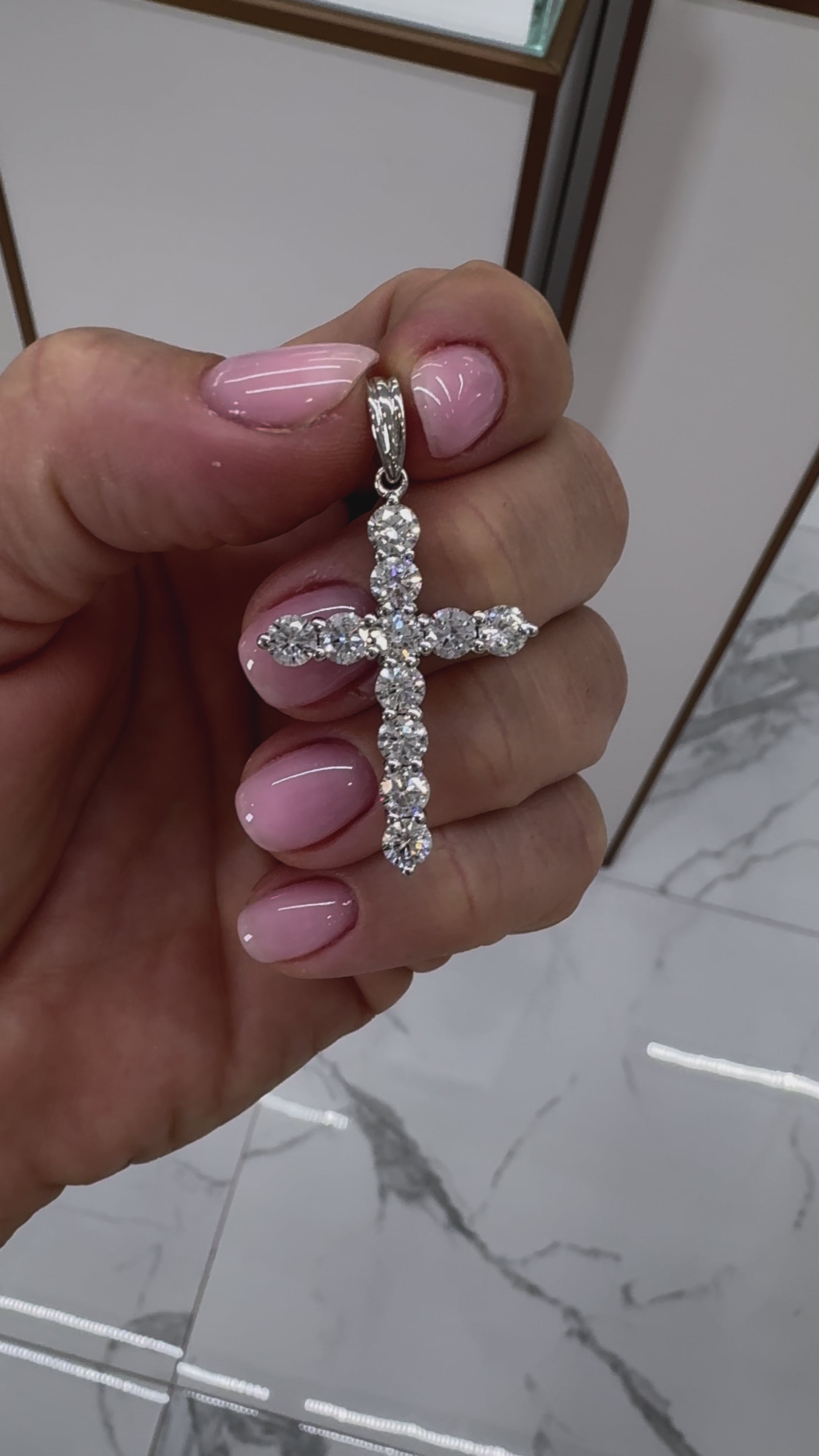 One 14K white gold religious diamond cross pendant. The metal was tested and determined to be 14K white gold. In excellent condition.