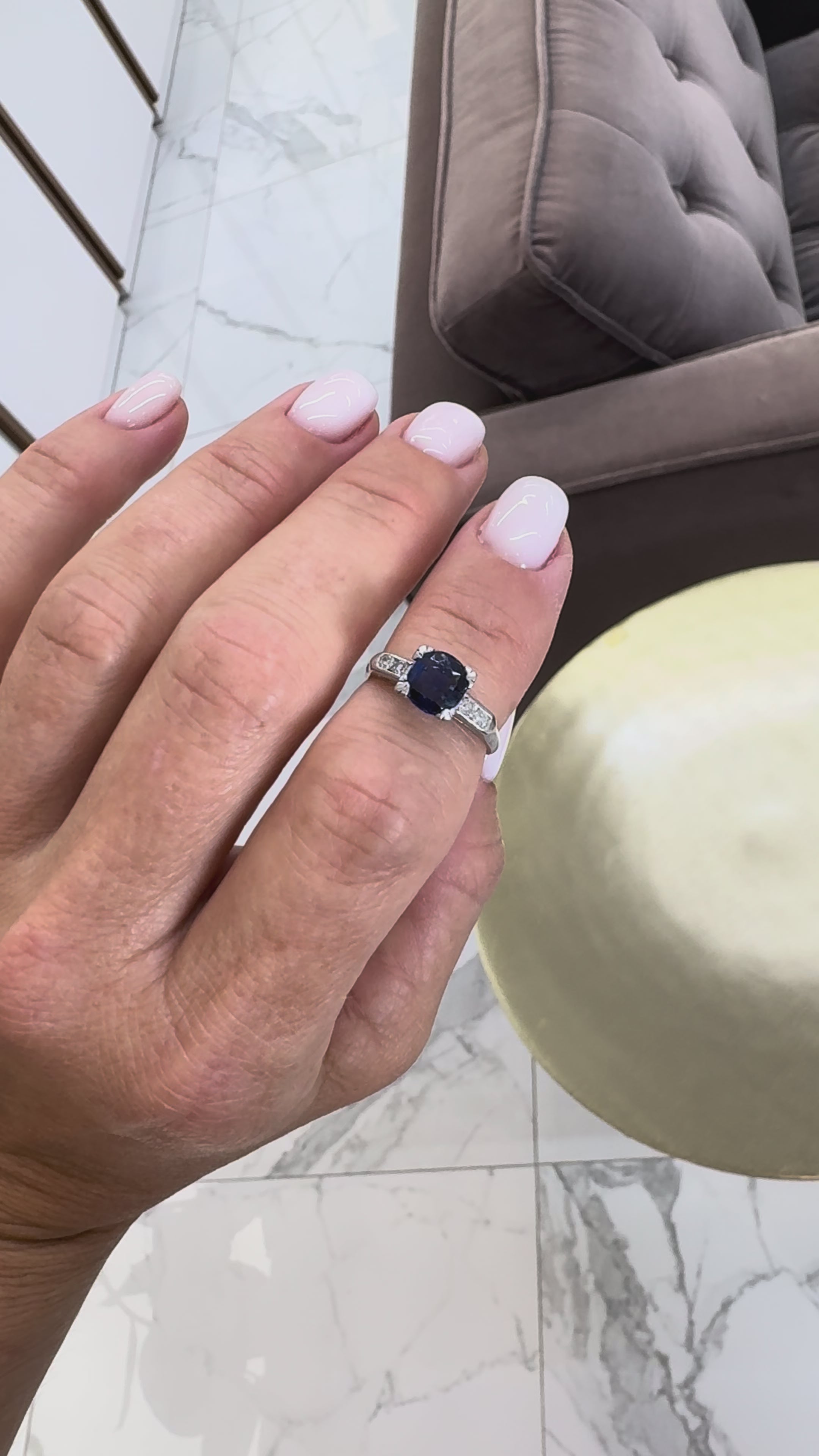 Lady's 900 platinum vintage diamond and sapphire engagement cocktail ring with a half-round shank. In very good condition.