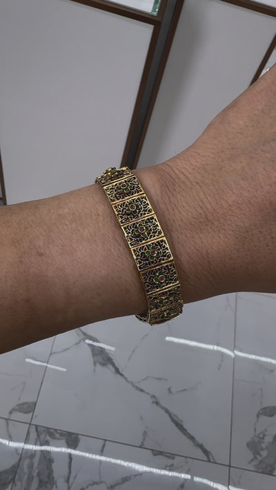 Vintage Handmade 18K Yellow Gold Ruby Flower Blue & Green Enamel Link Bracelet