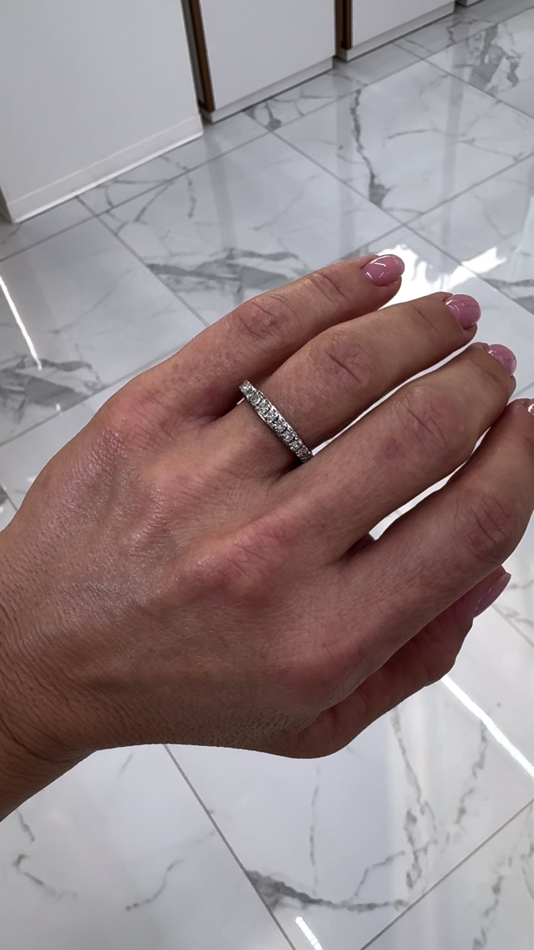 One ladies palladium silver and white gold diamond antique wedding eternity band with a soft-square shank. The metals were tested and determined to be palladium, 800 silver and 9 Karat white gold. In excellent condition.