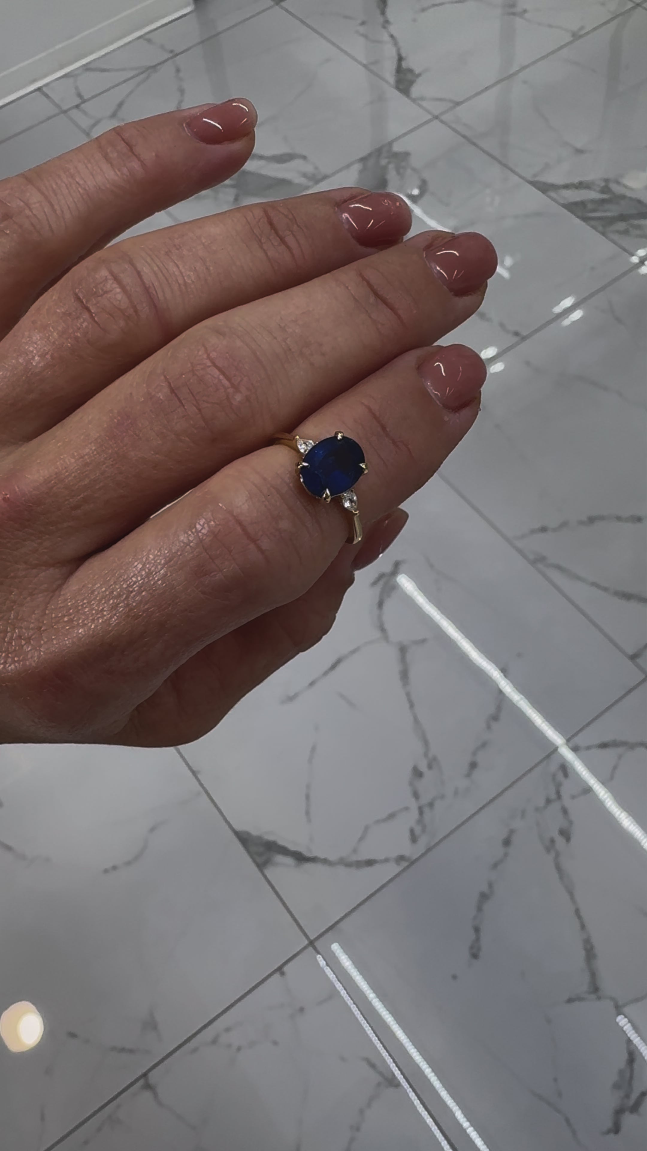 18K Yellow Gold 2.25ct Oval Sapphire Three Stone Pear Diamond Cocktail Ring