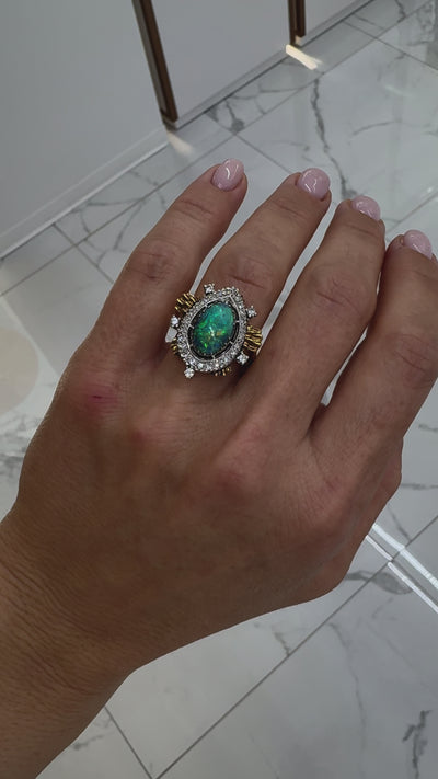 Vintage 18K Yellow Gold & Palladium AGL Australian Opal Diamond Cocktail Ring