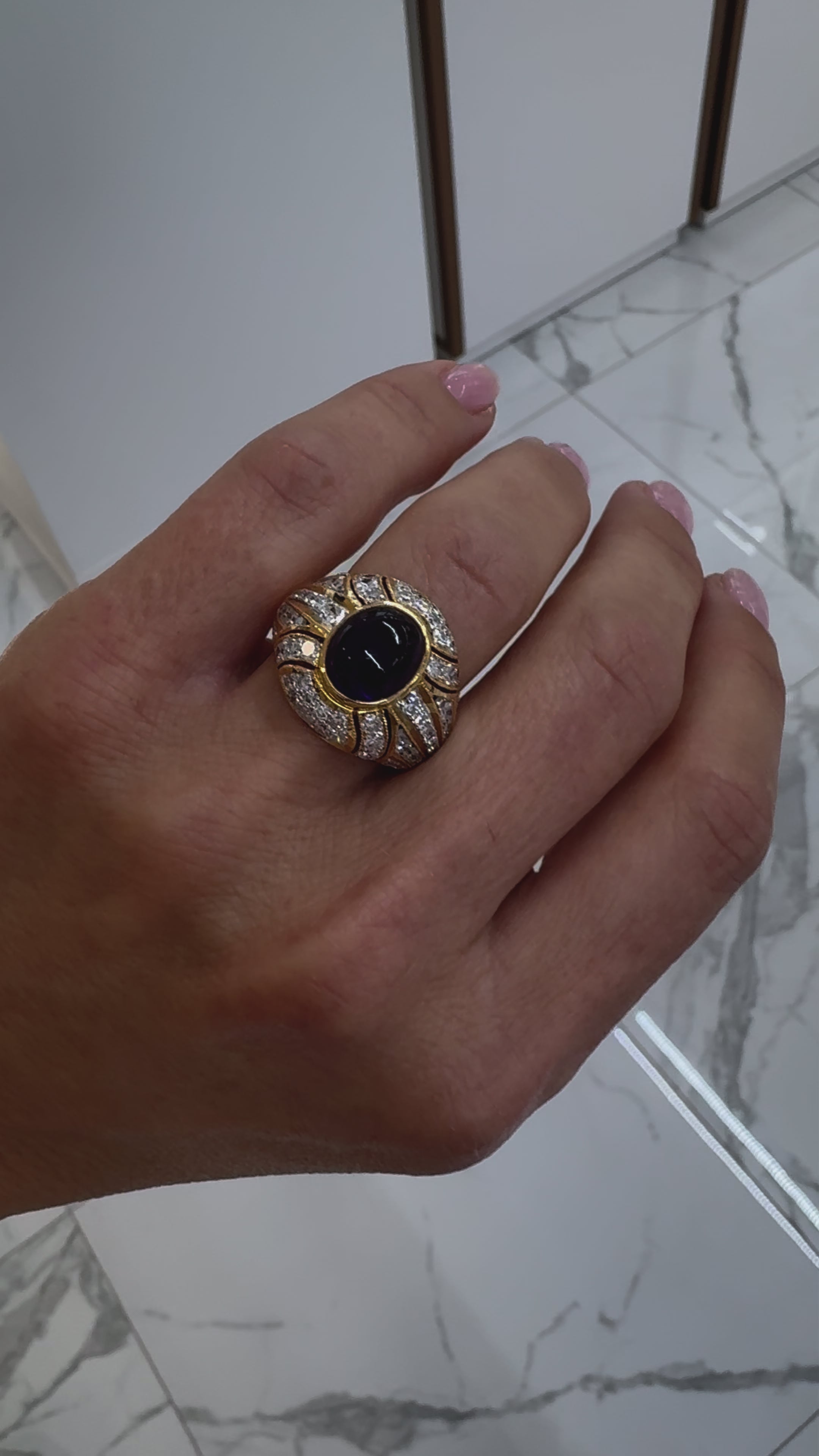 Vintage 18K Yellow Gold Oval Amethyst Accented Diamond Cocktail Ring