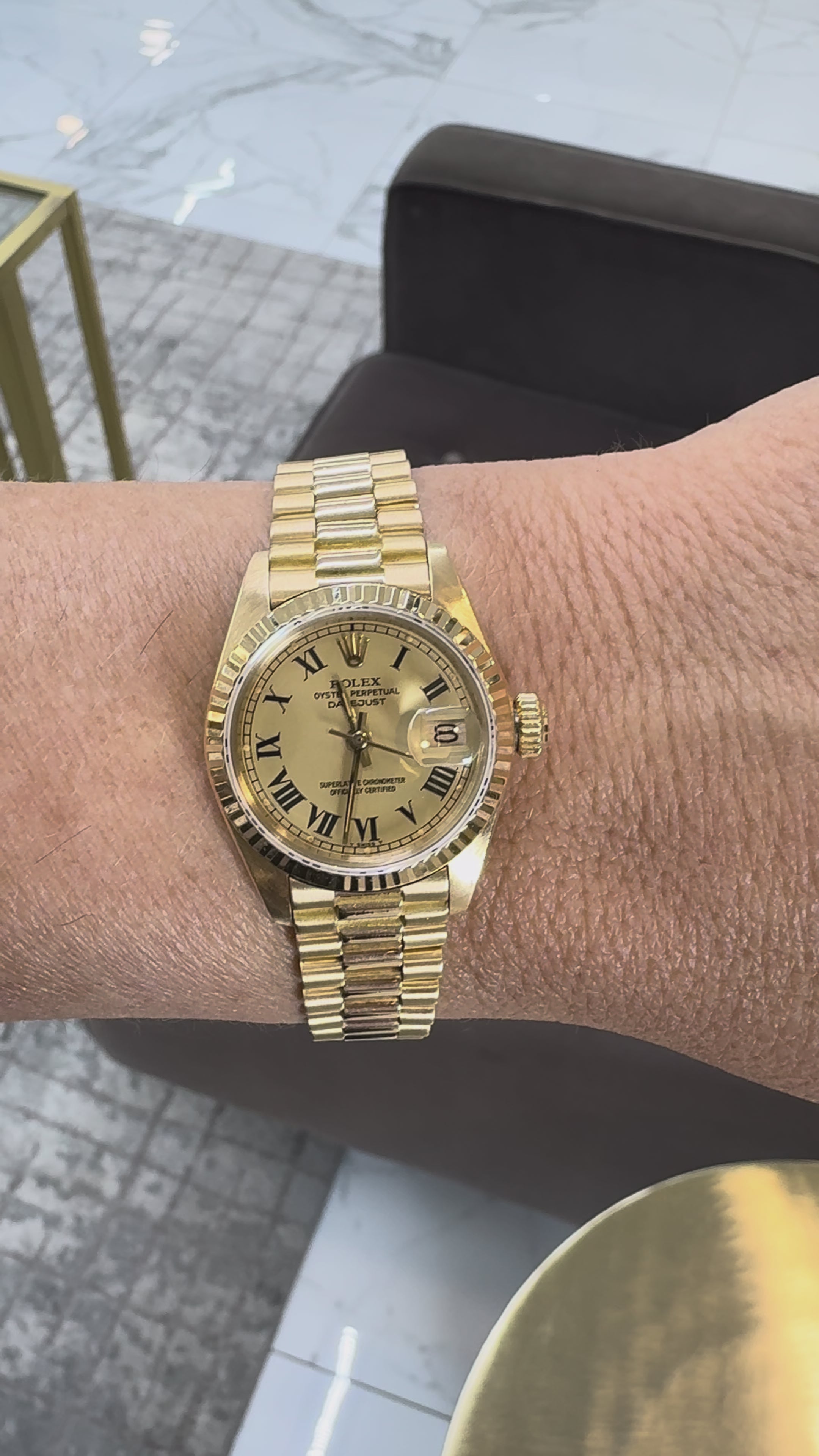 Lady's 18K yellow gold ROLEX Swiss-made wristwatch. The "ROLEX " trademark (or hallmark) can also be found on the item.