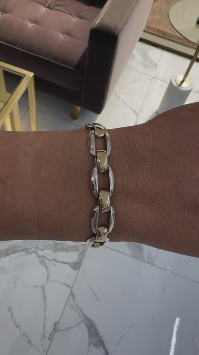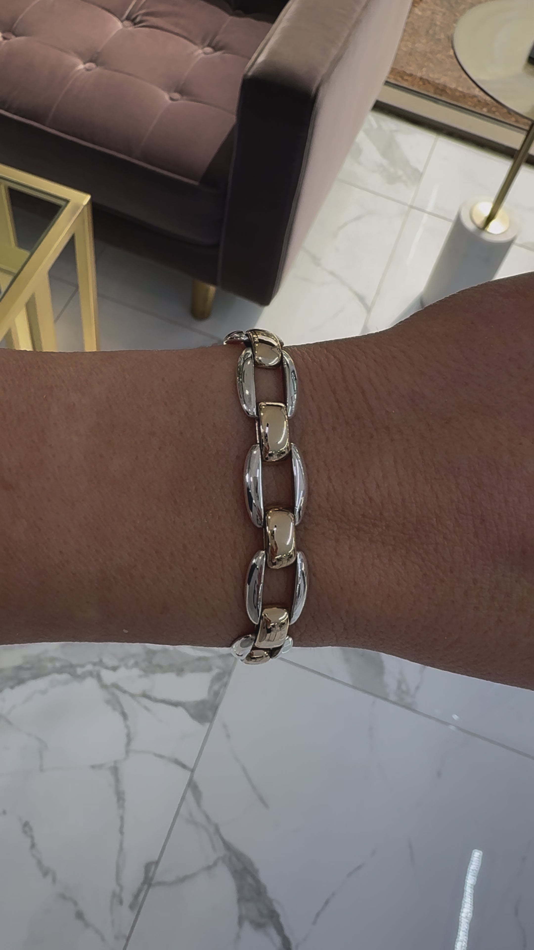 Ladies silver and 14K yellow gold clip-on bracelet. The metals were tested and determined to be 925 (STERLING) silver and 14 Karat yellow gold. Engraved with "14K" and "STERLING". The "James Avery" trademark (or hallmark) can also be found on the item.