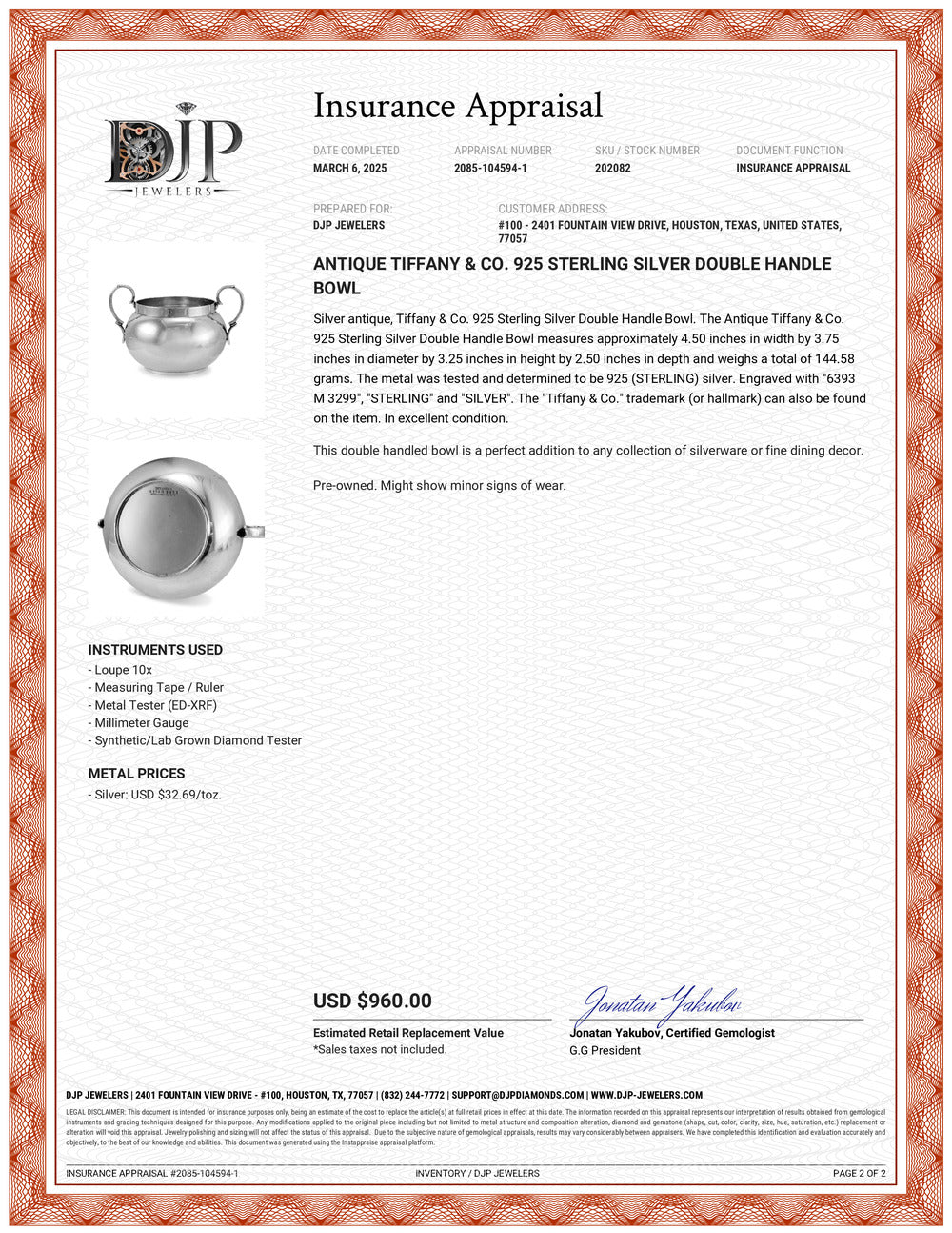 Silver antique Tiffany & Co. 925 Sterling Silver Double Handle Bowl. The metal was tested and determined to be 925 (STERLING) silver. Engraved with "6393 M 3299", "STERLING" and "SILVER". The "Tiffany & Co." trademark (or hallmark) can also be found on the item.