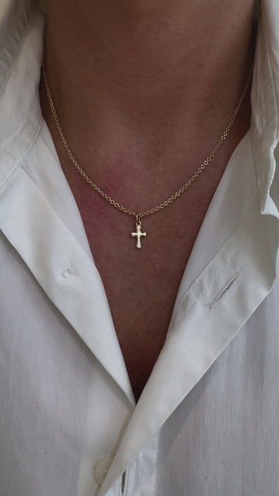 One JAMES AVERY ladies 14K yellow gold cable link chain and cross pendant. Engraved with "14K". The "JAMES AVERY" trademark (or hallmark) can also be found on the item.
