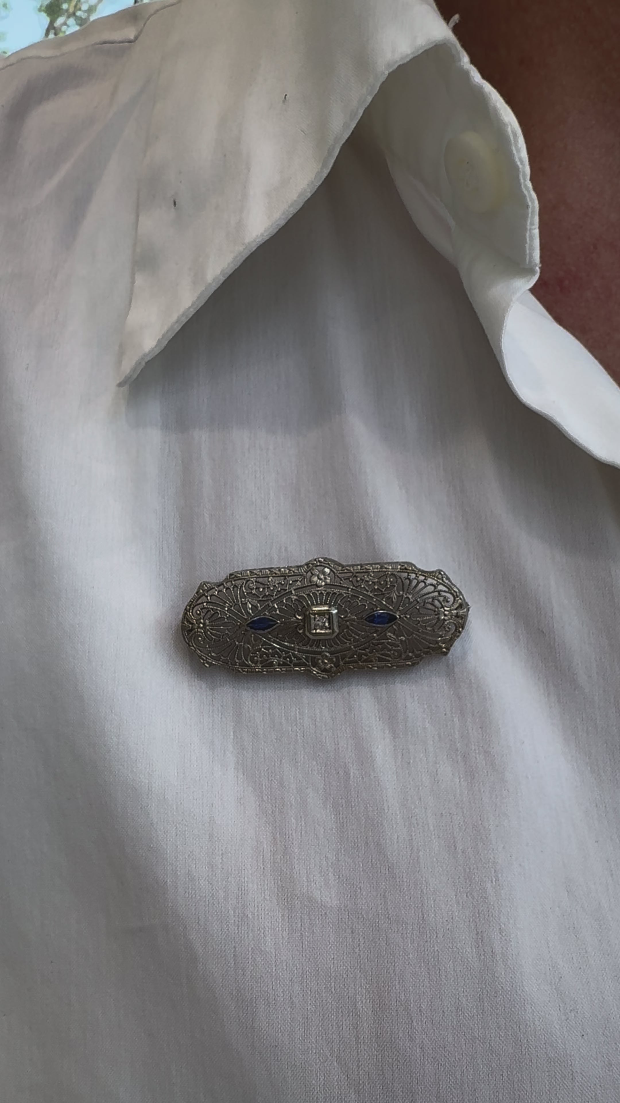Antique Art Deco 10K White Gold Filigreed Diamond & Sapphire Brooch