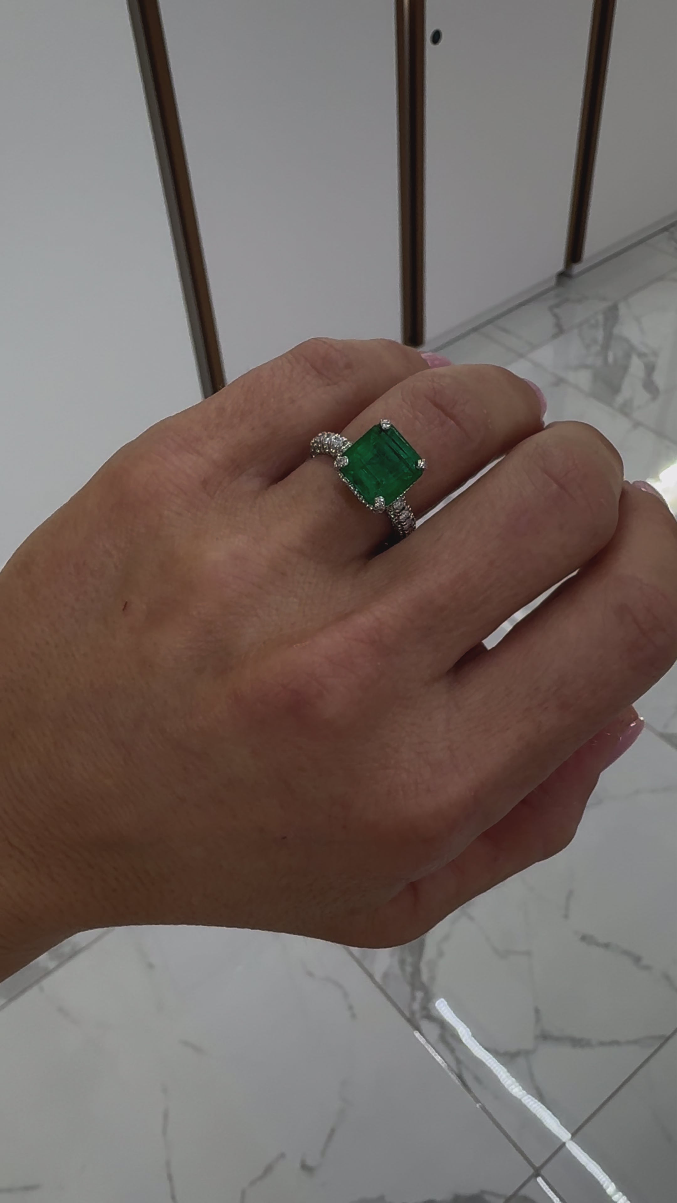 14K White Gold GIA 3.90ct Emerald Hidden Halo Accented Diamond Cocktail Ring