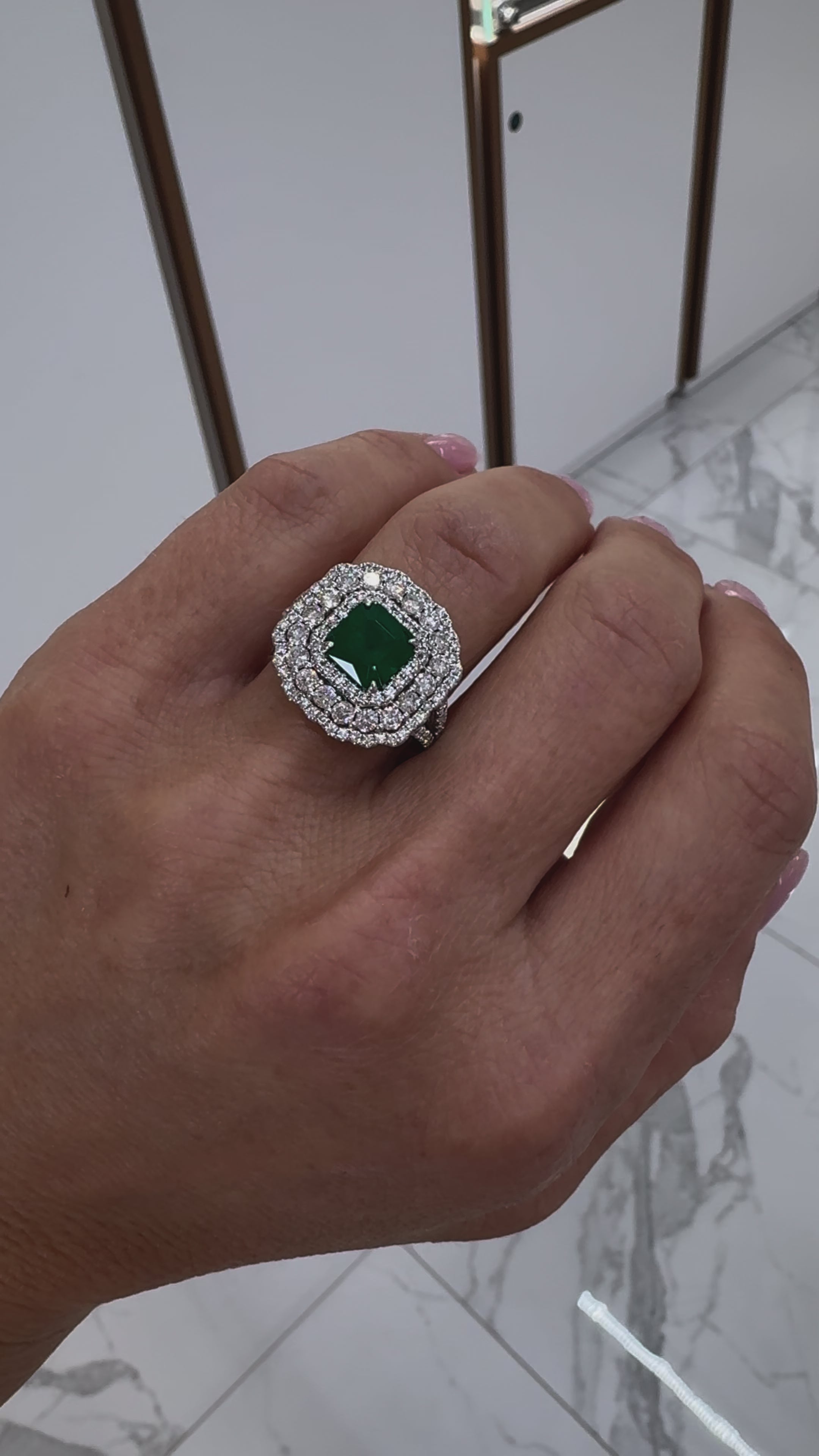 Ladies 18K White Gold Emerald Triple Halo Accented Diamond Cocktail Ring