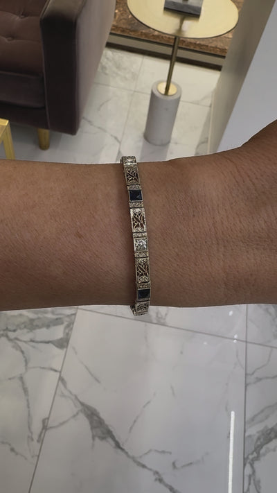 Antique Art Deco 14K White Gold Old European Cut Diamond Sapphire Link Bracelet