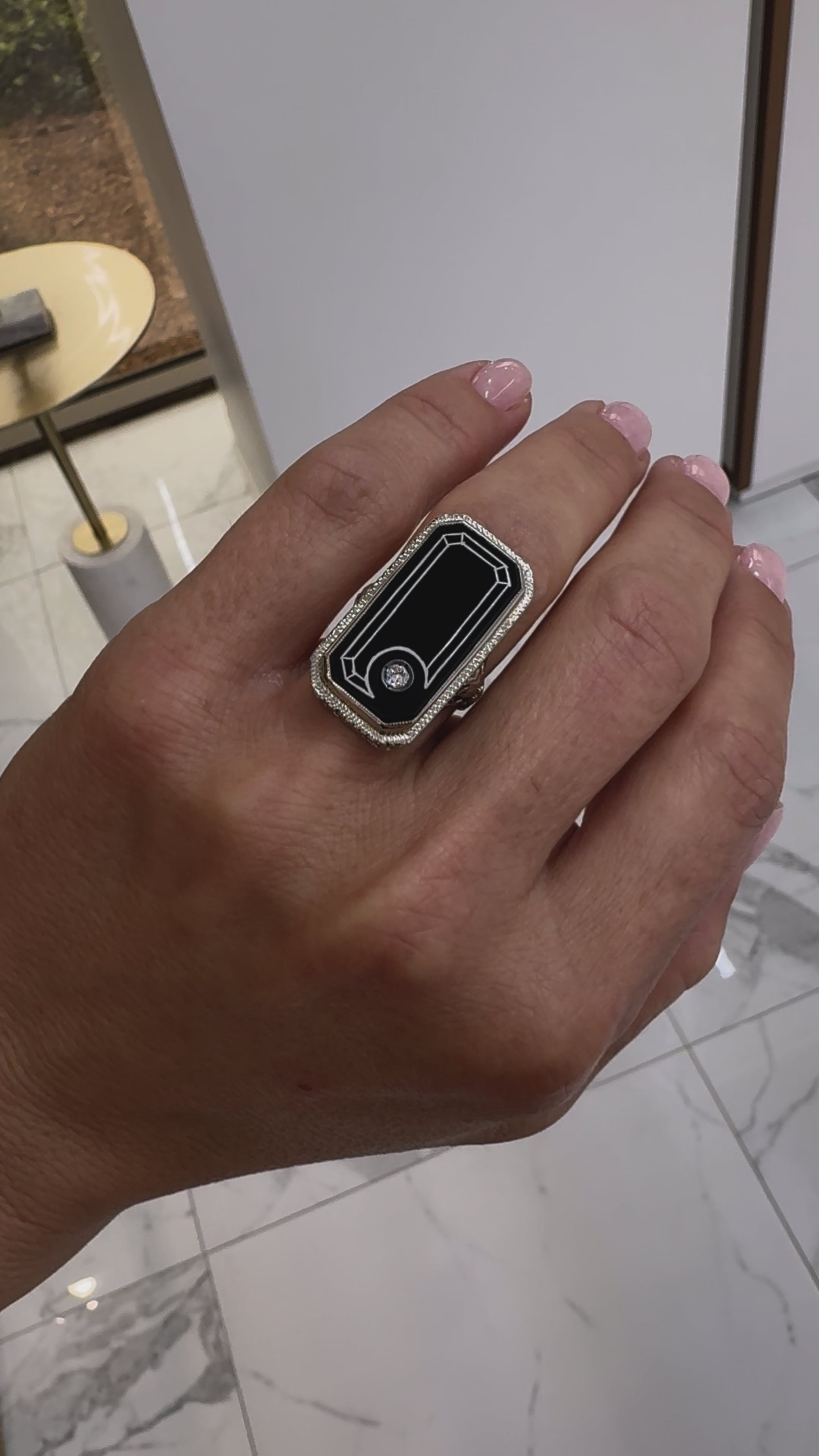 Antique 18K White Gold Rectangular Black Onyx Circular Diamond Cocktail Ring