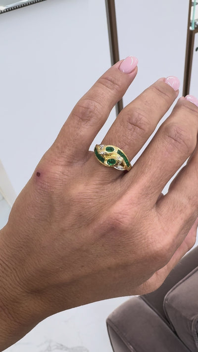 Vintage 18K Yellow Gold Emerald Diamond Bypass Double Snake Cocktail Ring