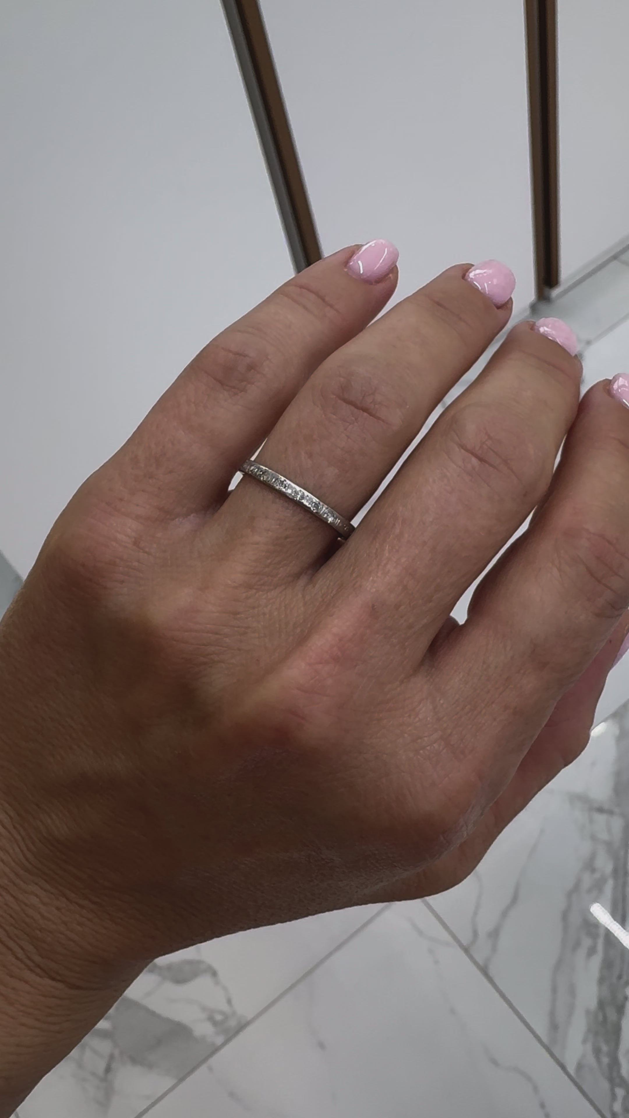 One ladies hand-engraved platinum seven-across diamond antique wedding band with a half-round shank. The metal was tested and determined to be platinum. Engraved with "PLATINUM". In excellent condition.