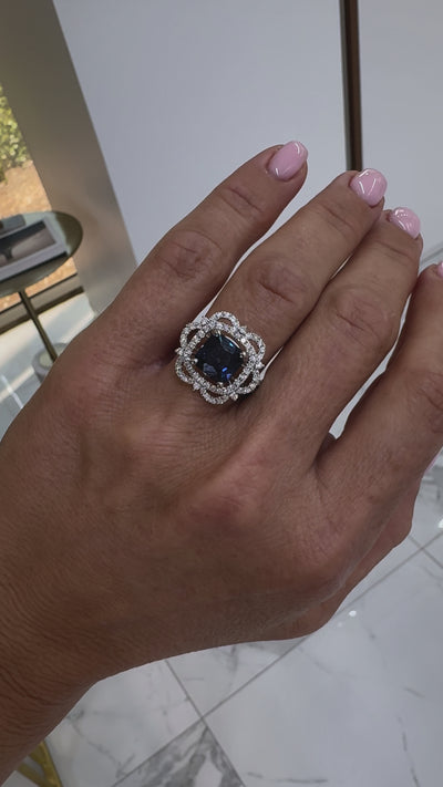 Ladies 14K White Gold Blue Spinel Halo Diamond Flower Cocktail Ring