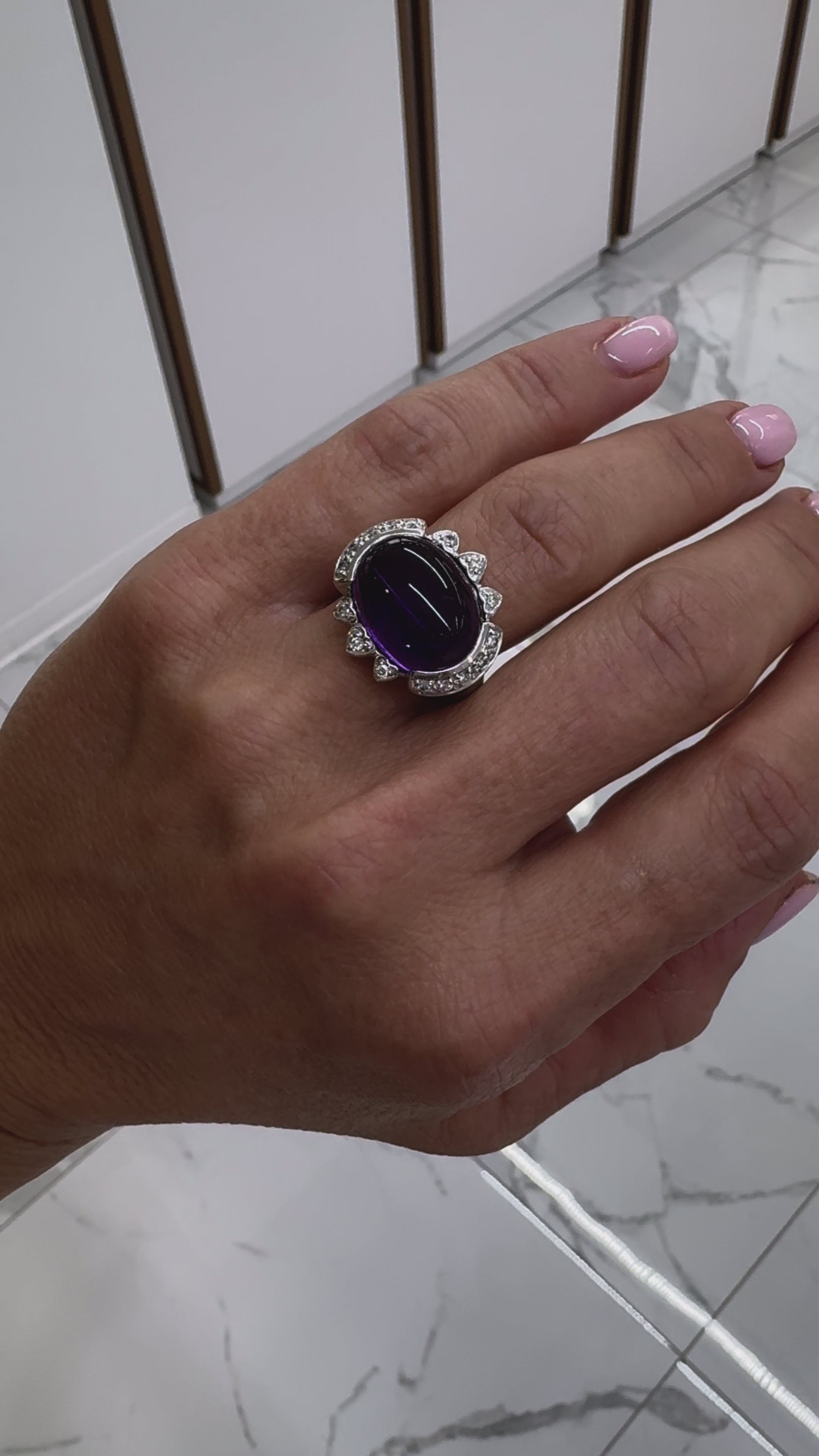 Vintage 18K White Gold Halo Diamond 7.44ct Amethyst Cabochon Cocktail Ring