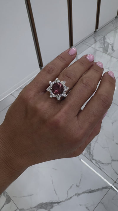 Ladies 18K White Gold Burgundy Spinel Halo Diamond Flower Cocktail Ring