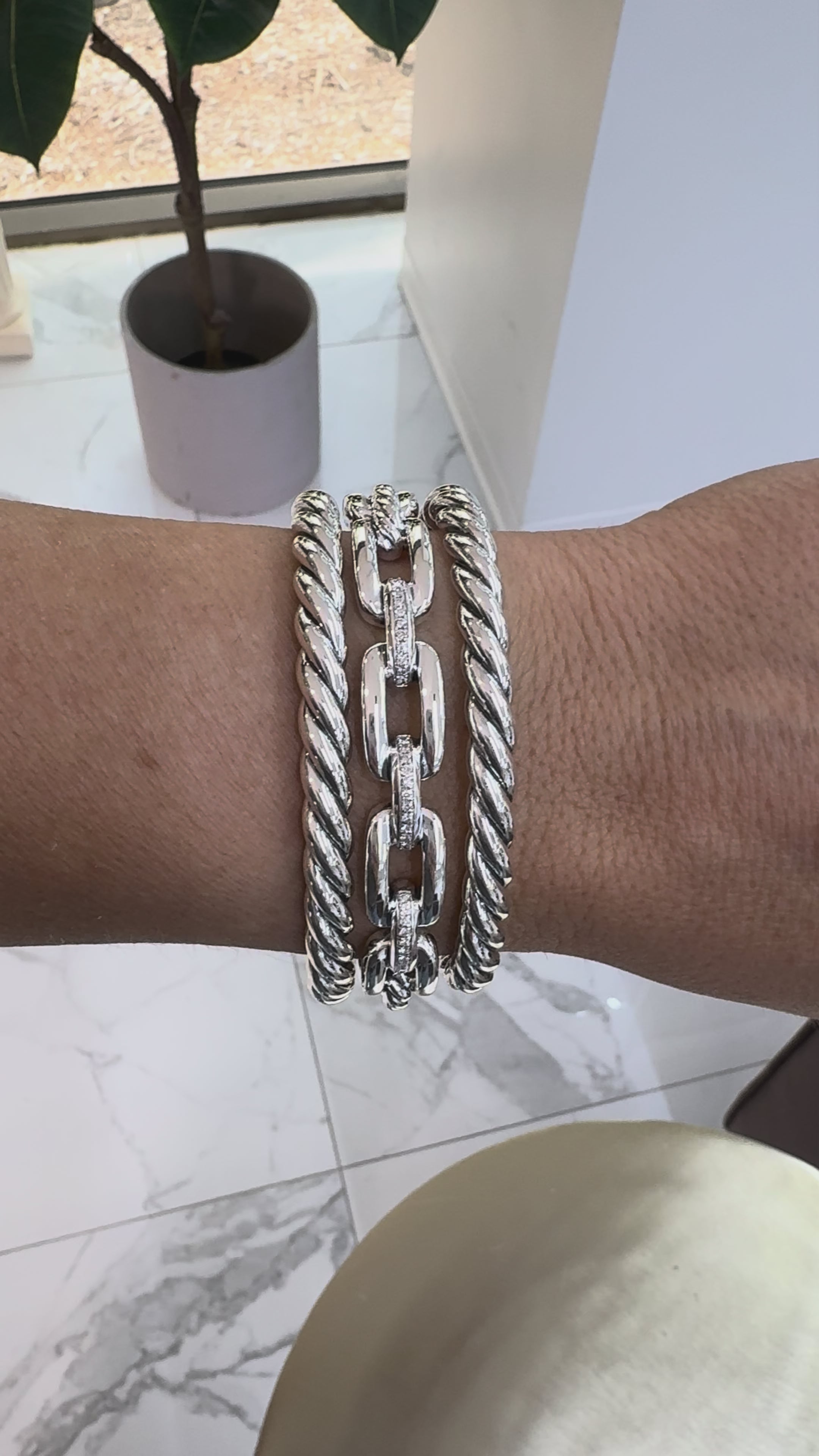 David Yurman 925 Silver Wellesley Three-Row Diamond Cuff Bangle Bracelet