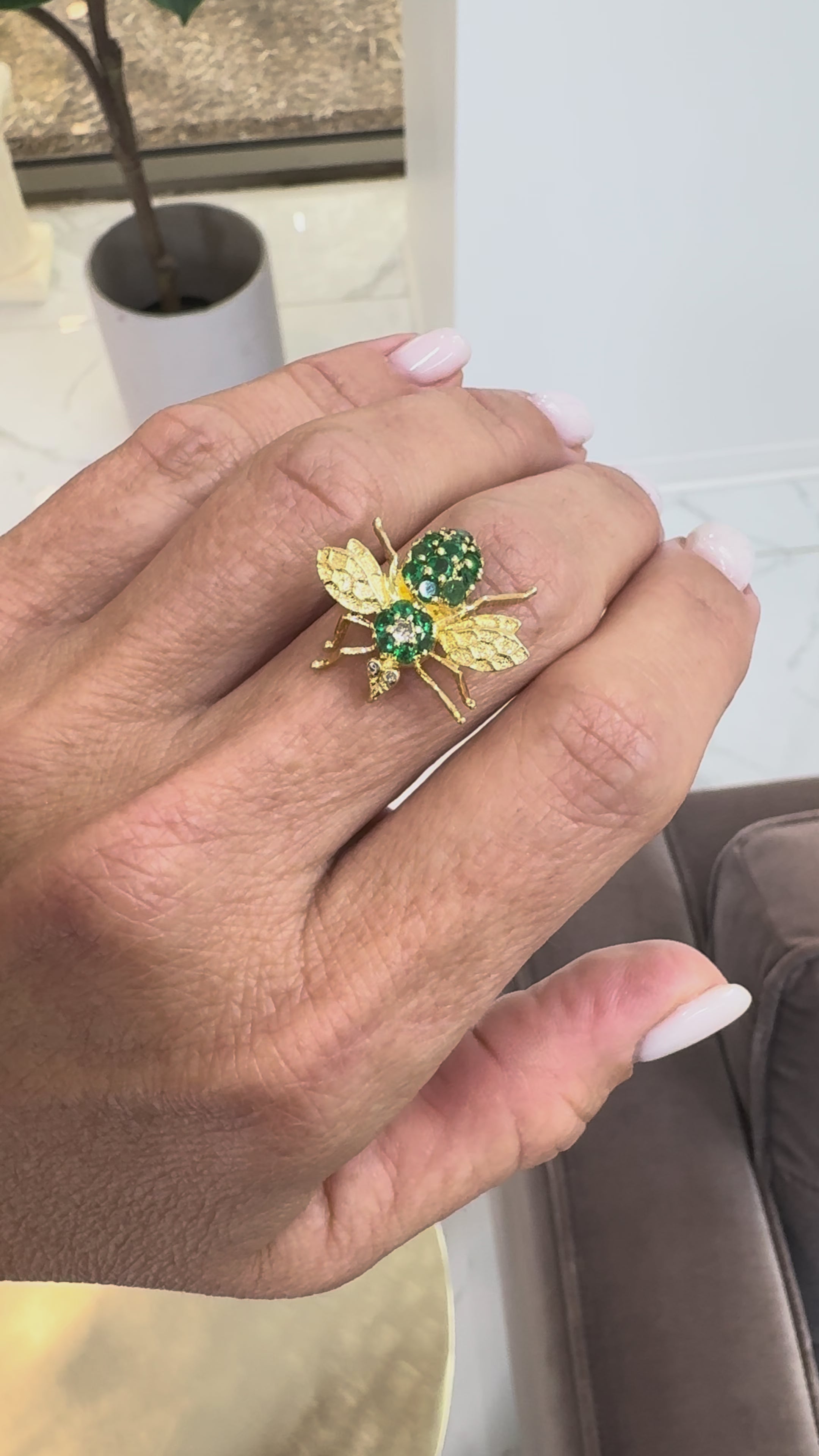 Vintage 18K Yellow Gold Green Emeralds Diamond Bee Pendant