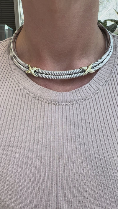 David Yurman 925 Silver 14K Gold Double X Cable Classic Choker Collar Necklace