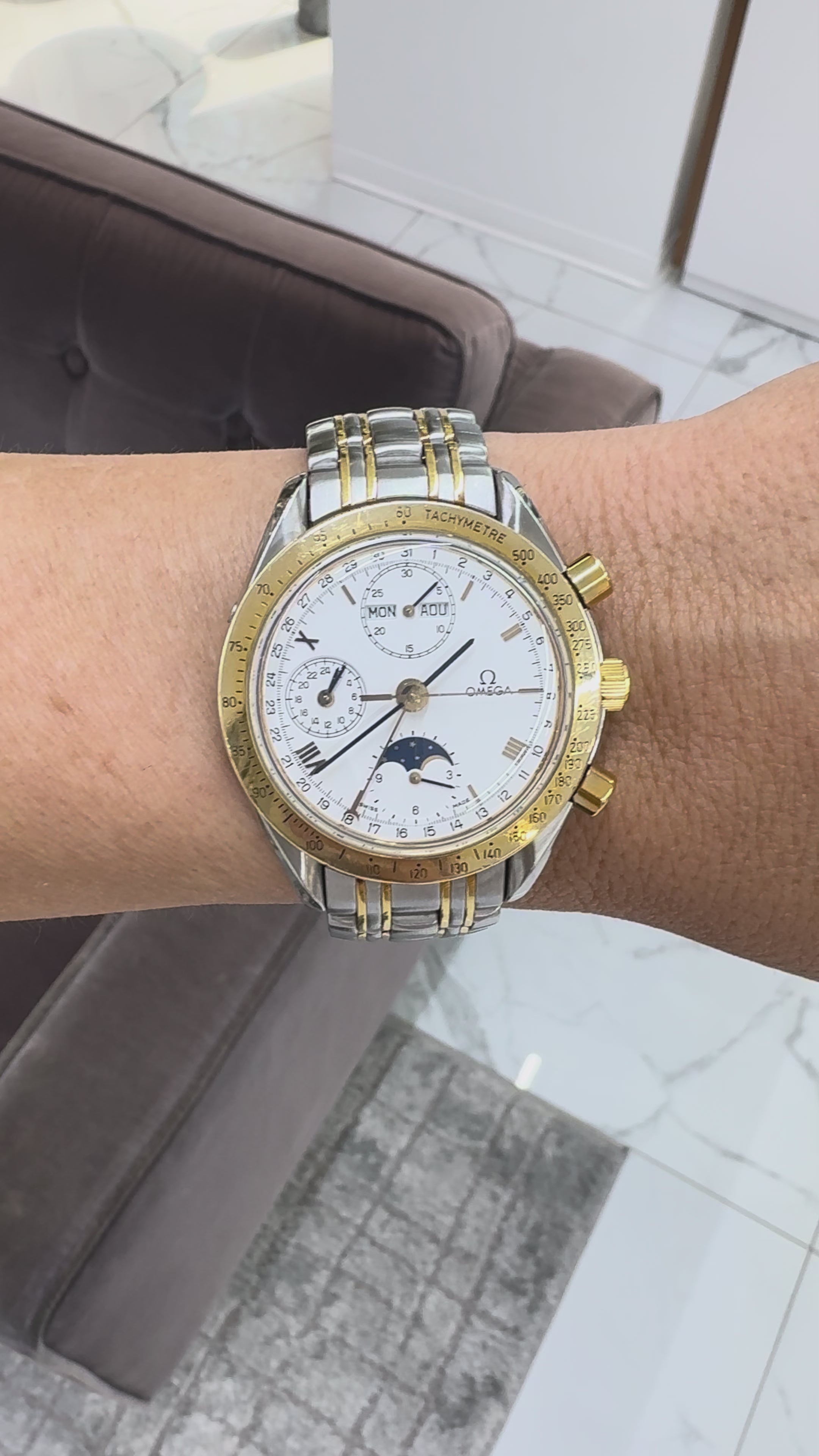 OMEGA SPEEDMASTER MOONPHASE MoonPhase White Dial Triple Calendar Gent's, 18K yellow gold and stainless steel, OMEGA Swiss-made wristwatch with original papers. The "OMEGA " trademark (or hallmark) can also be found on the item.