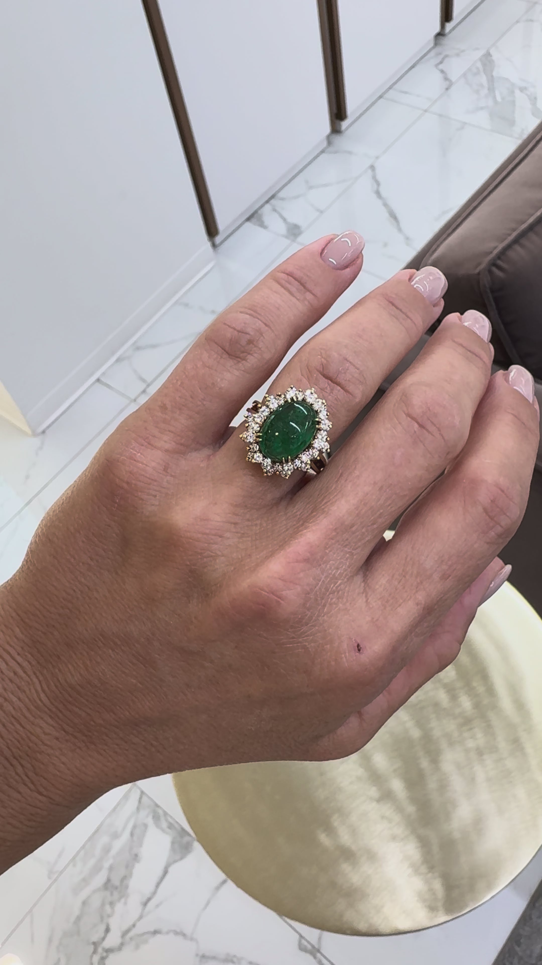 Vintage 18K Yellow Gold GIA Emerald Halo Diamond Cocktail Ring