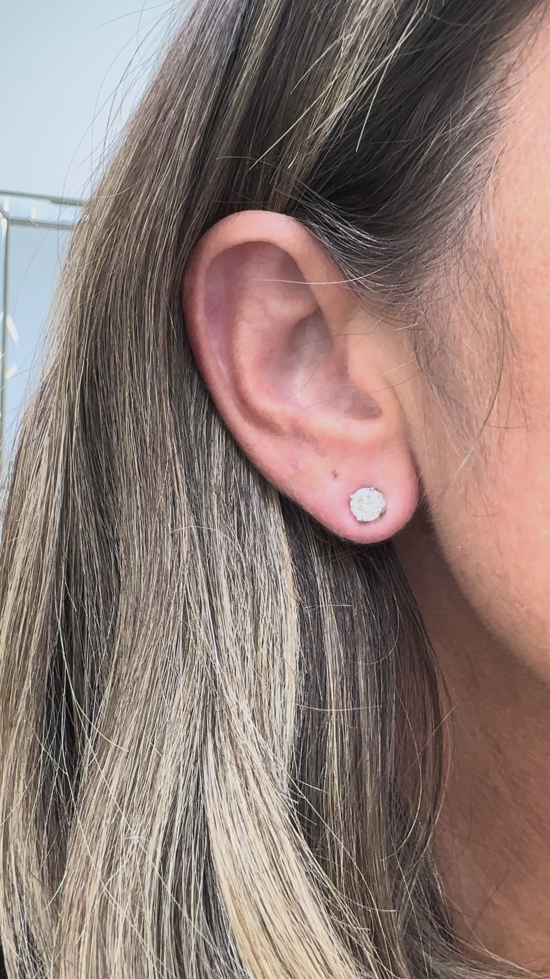 One pair of rhodium-plated 14K white gold diamond stud earrings with screw backs. Engraved with "585".