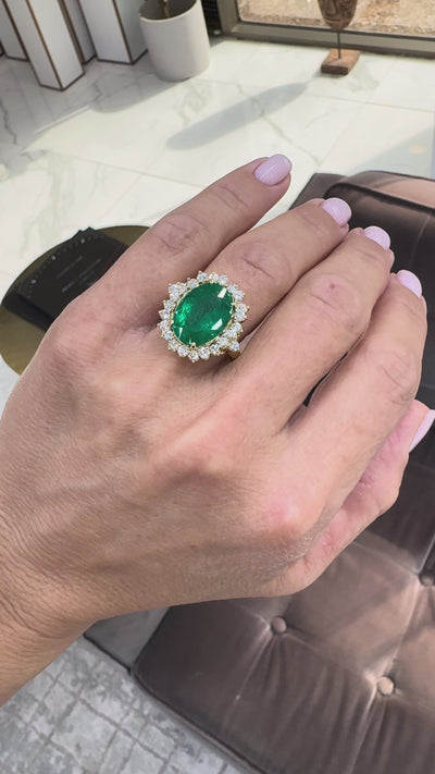 Vintage 18K Yellow Gold 6.68ct GIA Brazilian Emerald Halo Diamond Cocktail Ring