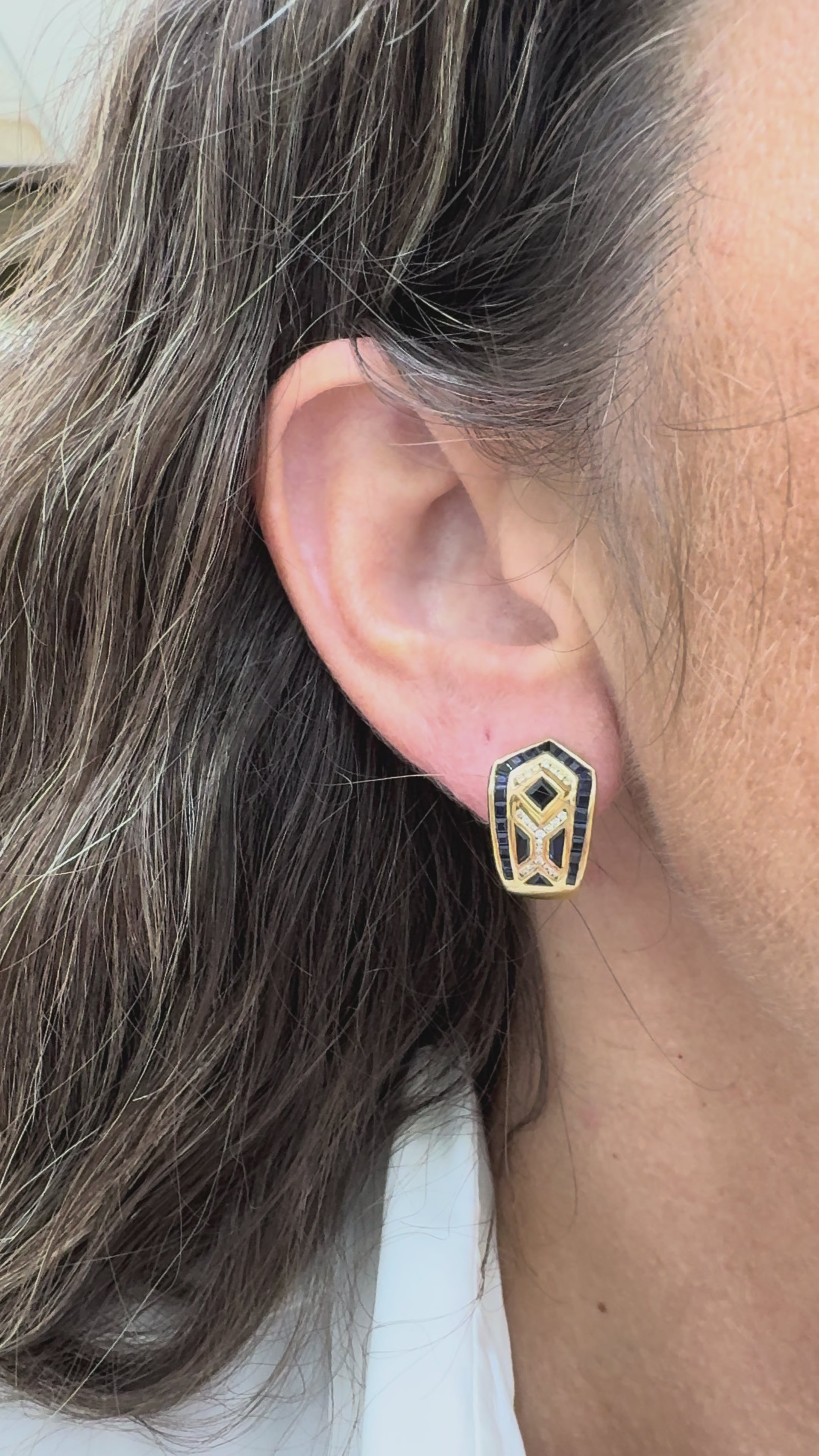 Vintage Hollywood Jewels 18K Yellow Gold Sapphire Diamond J Hoop Clip Earrings