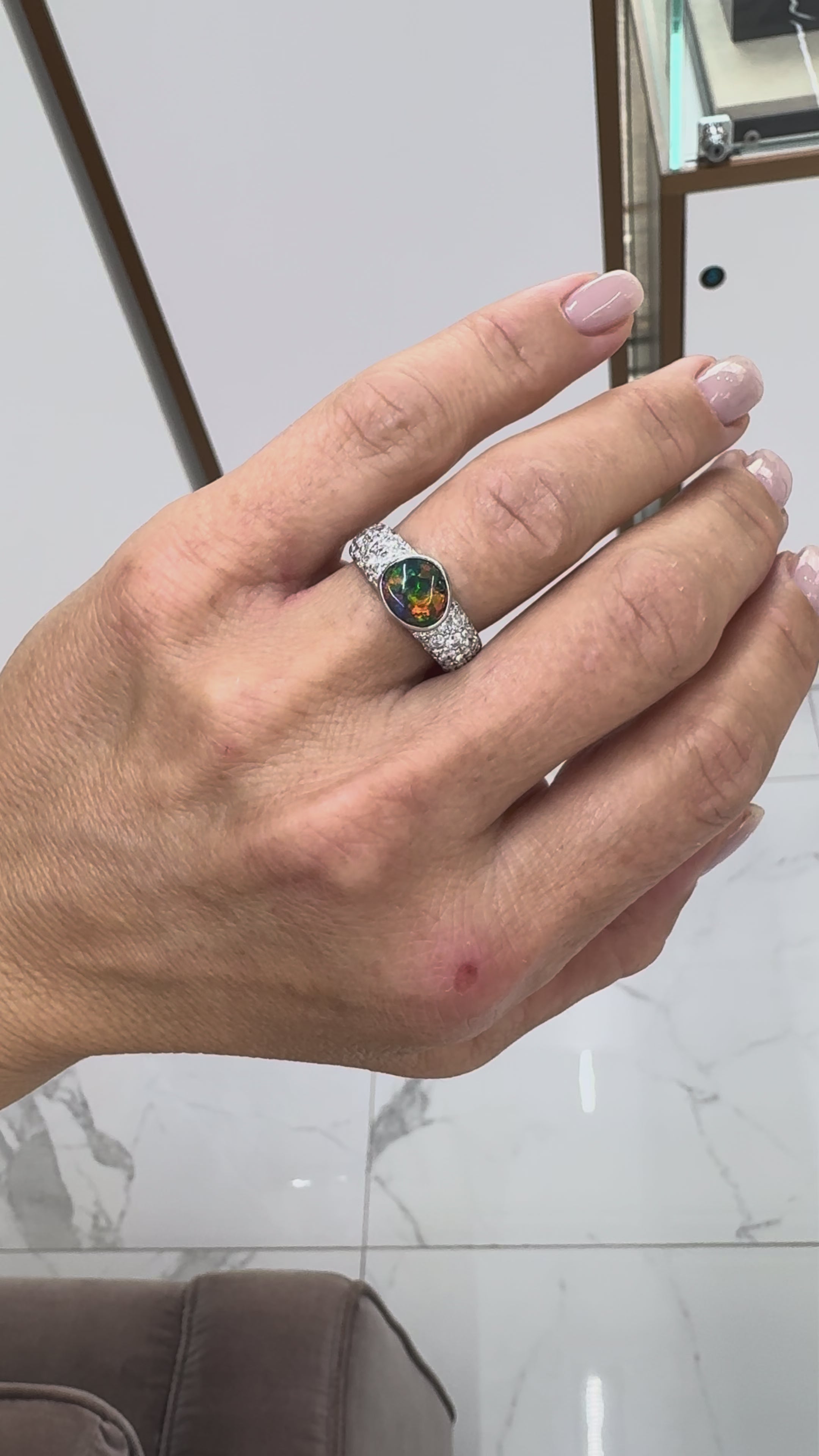 18K White Gold AGL Australian Multi Colored Black Opal Diamond Cocktail Ring