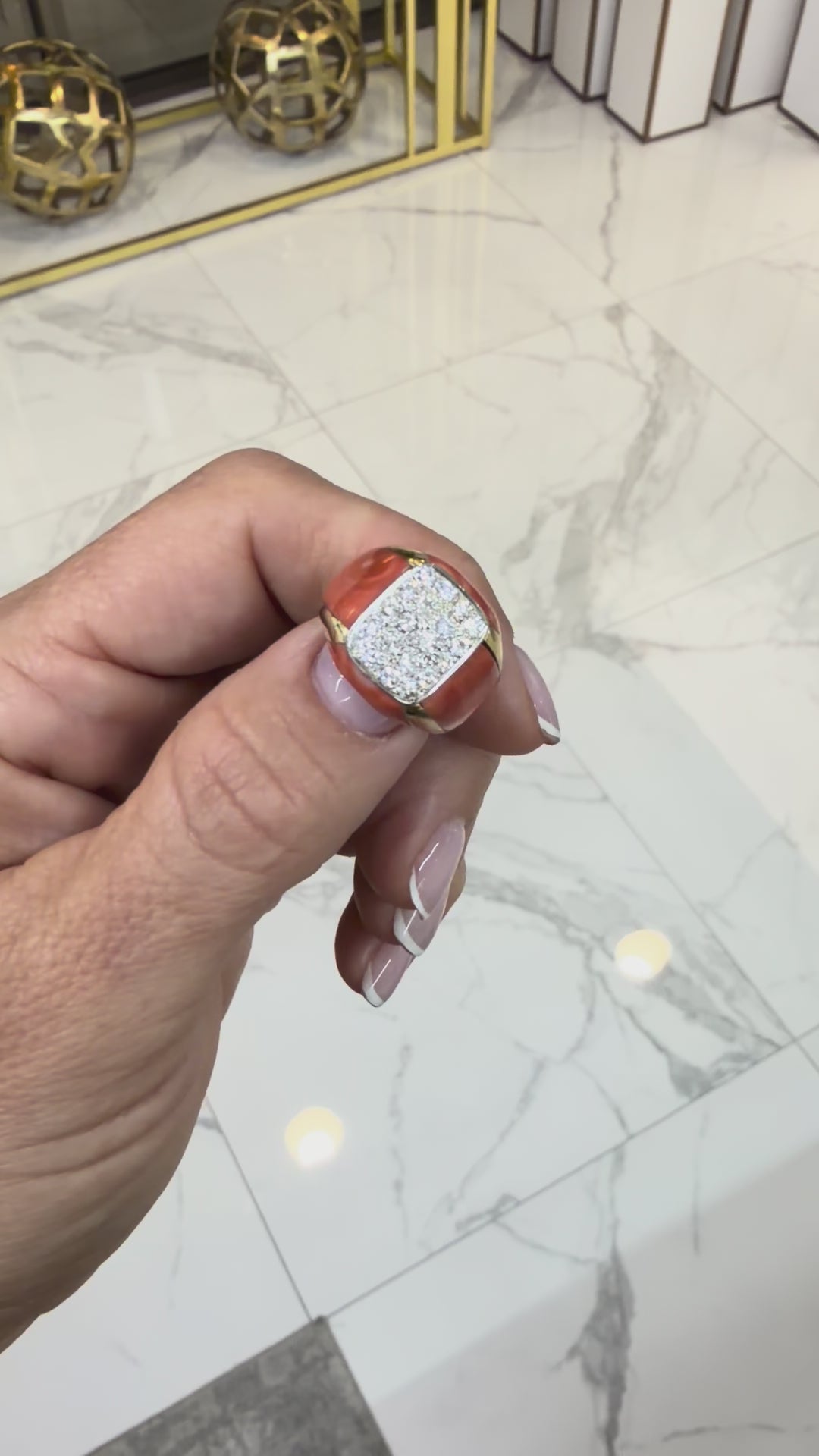 Ladies Vintage 18K Yellow Gold Salmon Coral Pave Diamond Cocktail Ring