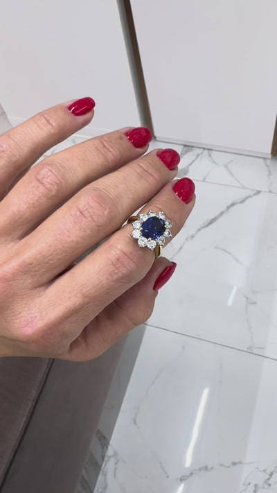 Vintage 18K Gold 2.98ct GIA Ceylon Royal Blue Sapphire Halo Diamond Cocktail Ring