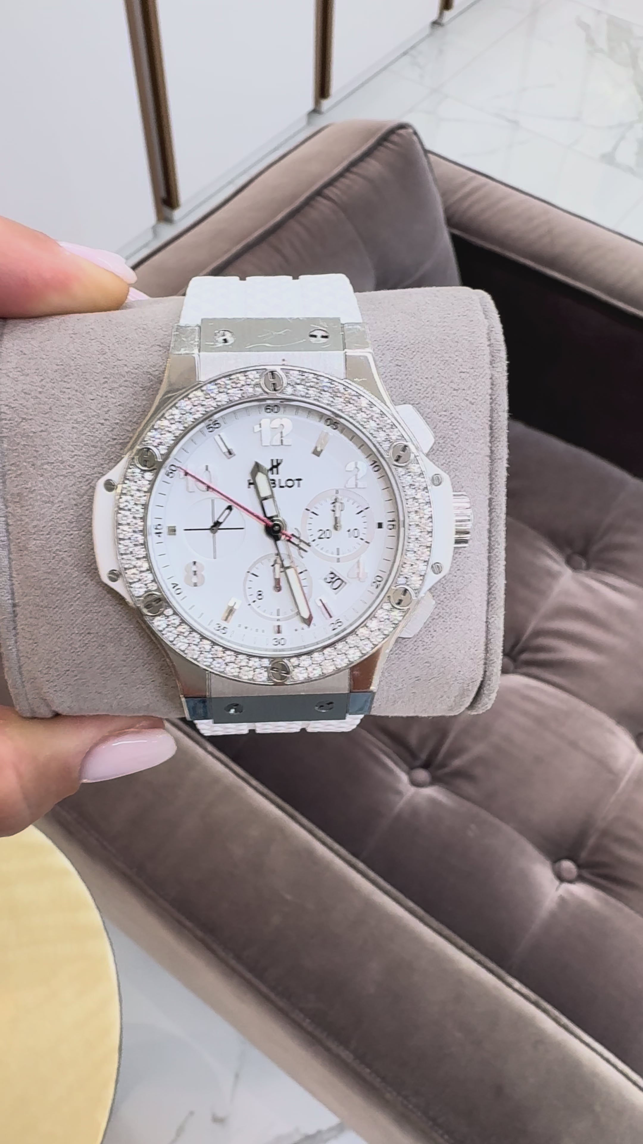 Stainless steel diamond HUBLOT Swiss-made wristwatch with original box, Receipt, and Hublot Warranty Papers. Engraved with "St Steel". The "HUBLOT " trademark (or hallmark) can also be found on the item.