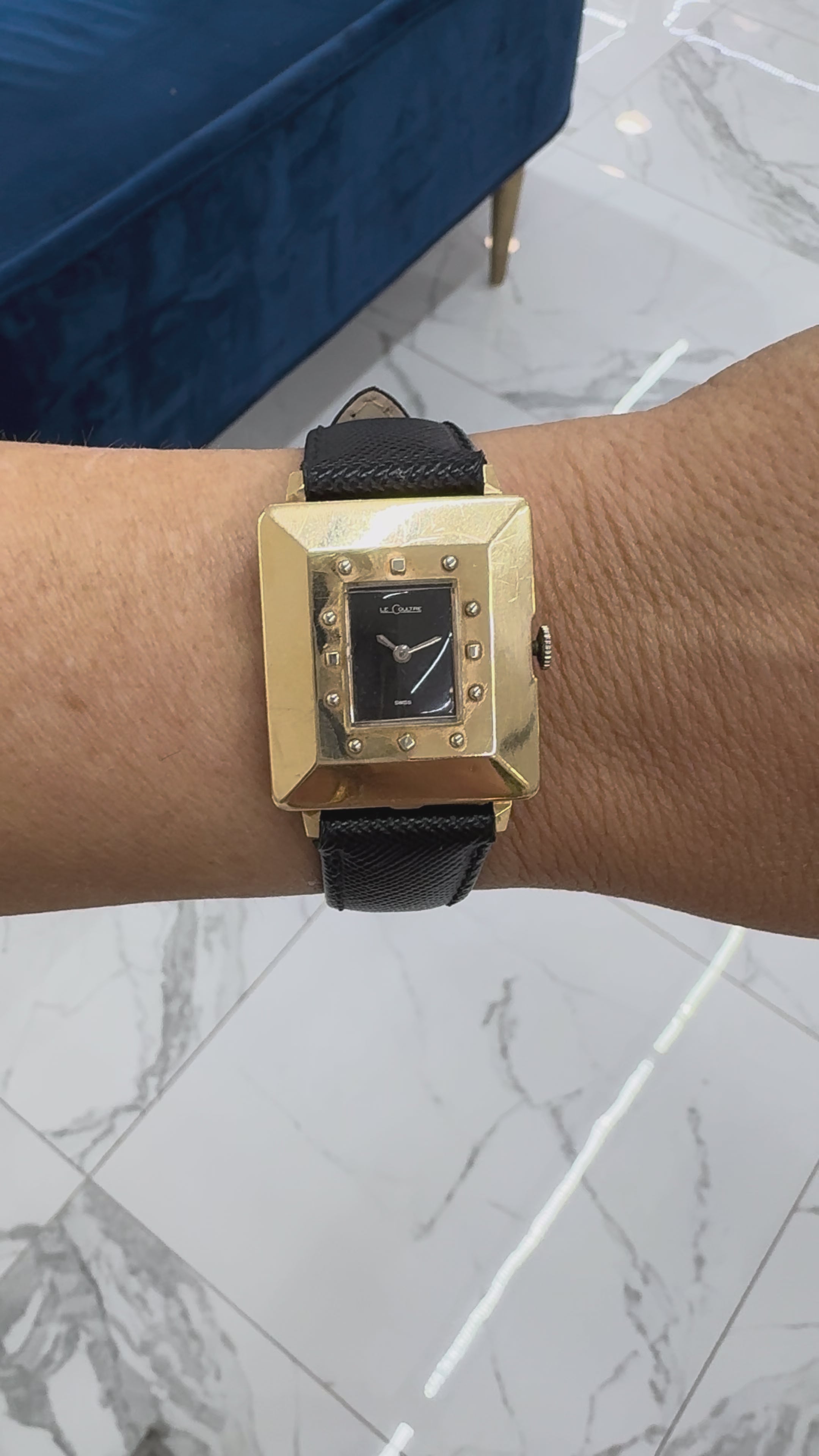 14K yellow gold, Jaeger-LeCoultre Swiss made wristwatch. Engraved with "14K". The "LECOULTRE" trademark (or hallmark) can also be found on the item. In very good condition.
