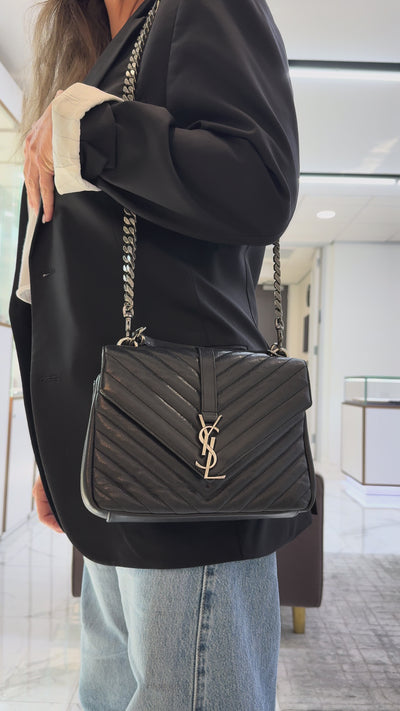 Saint Laurent College Medium Black Quilted Leather Top Handle Crossbody Bag. Engraved with "Made In Italy". The "Saint Laurent" trademark (or hallmark) can also be found on the item.