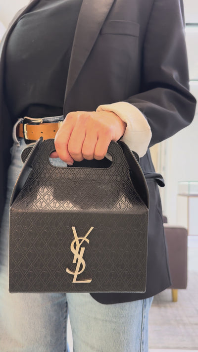 Saint Laurent Calfskin Monogram Take Away Black Box Top Handle Bag. Engraved with "Made In Italy". The "Saint Laurent " trademark (or hallmark) can also be found on the item.